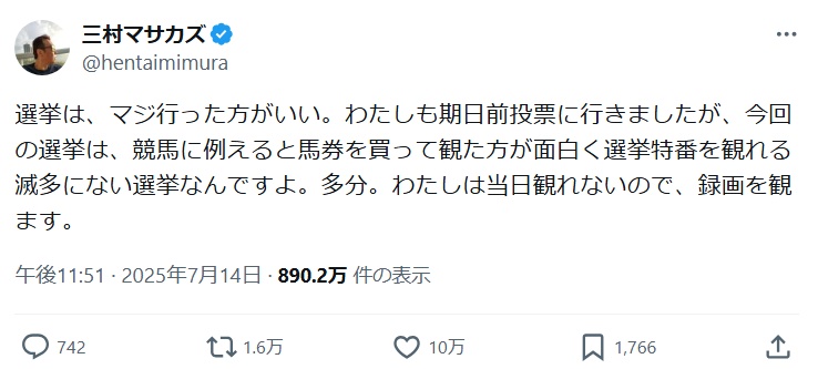 三村マサカズ「選挙は馬券買って競馬を見るようなもの」 ←シュババババ(走り寄ってくる音) 2025/7/23 速報 1: 選挙は、マジ行った方がいい。 わたしも期日前投票に行きましたが、今回の選挙は、競馬に例えると馬券を買って観た方が面白く選挙特番を観れる滅多にない選挙なんですよ。多分。 わたしは当日観れないので、録画を観ます。 document.write(” + ”); 関連記事 【動画】さまぁ〜ず三村の女子お触り動画、今なら絶対許されないw 【画像】三村マサカズのポスト、気持ち悪さの限界を突破 【松本性加害疑惑】三村マサカズ、滅茶苦茶煽るwwwwwwwwwww 【悲報】さまぁ~ず三村さん、相方やウッチャンに怒られ謝罪 【速報】三村マサカズさん、突如ぶちギレてTwitter引退宣言。 document.write(” + ”); 続きを読む ——— Source: アルファルファモザイク 三村マサカズ「選挙は馬券買って競馬を見るようなもの」 ←シュババババ(走り寄ってくる音)