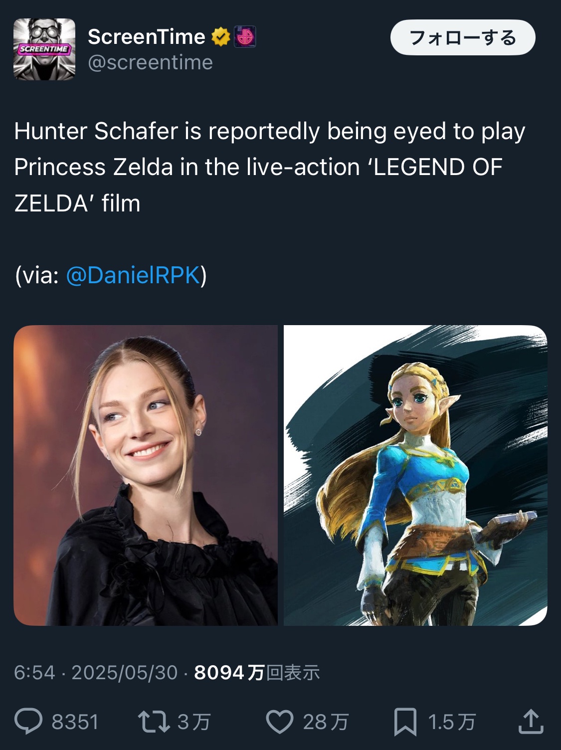 トランス女性(身体男性)のハンター・シェイファーがゼルダ役だという噂が流れその説に28万いいねがつき支持される