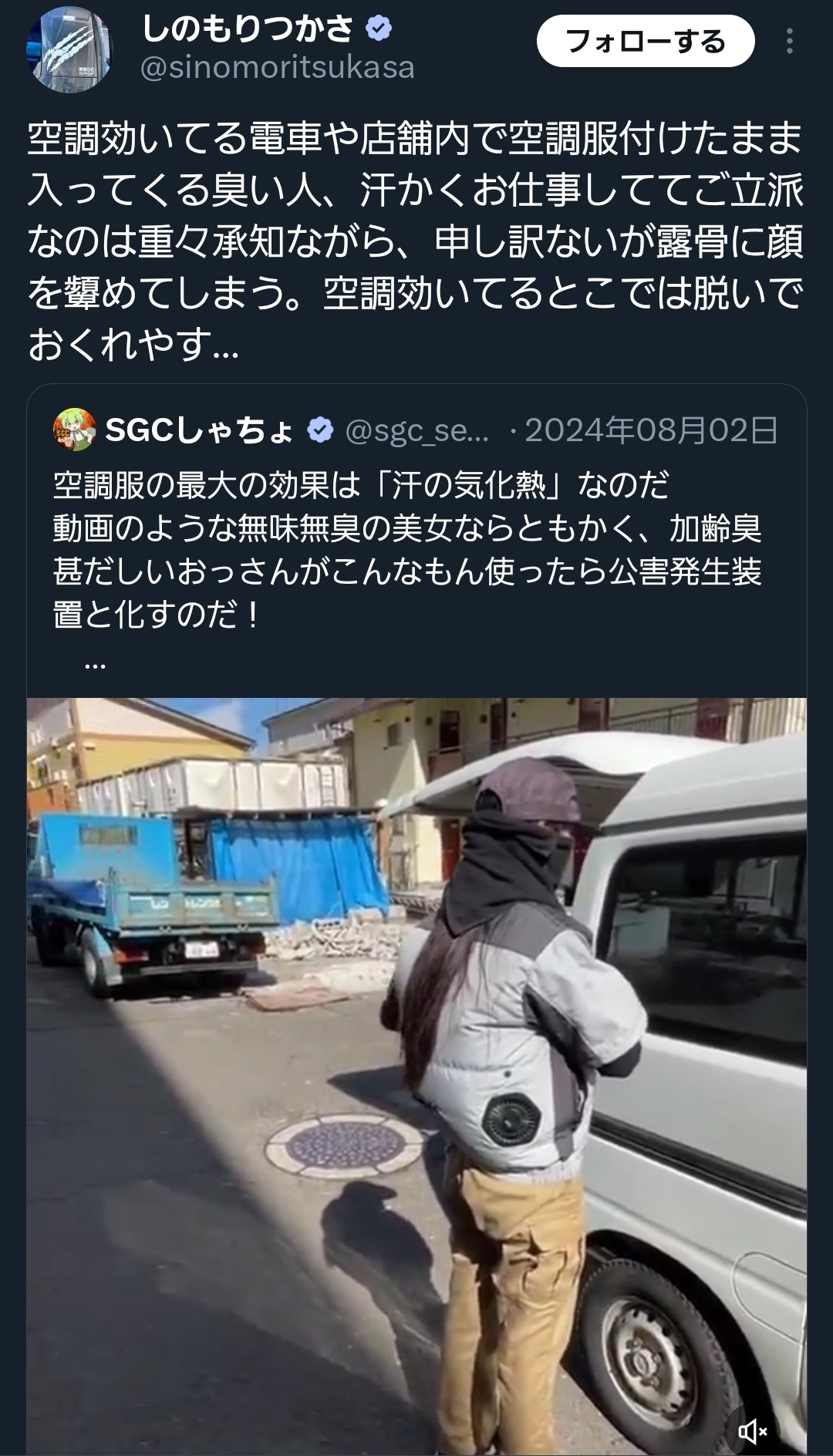 ネット民さん「電車で空調服おじさんがニオイ拡散してて地獄だった」 2025/7/25 速報 1: https://x.com/sinomoritsukasa/status/1819751845117694009 document.write(” + ”); 関連記事 【画像】空調服着て「日本一の山」に登るでwww 【地獄絵図】Amazonで空調服を購入した男性、バッテリーから発火し家が焼失してしまう。。。 document.write(” + ”); 続きを読む ——— Source: アルファルファモザイク ネット民さん「電車で空調服おじさんがニオイ拡散してて地獄だった」