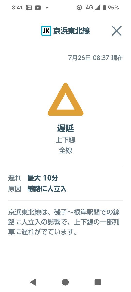 京浜東北線は、磯子〜根岸駅間での線路に人立入の影響で、上下線の一部列車に遅れがでています。 #京浜東北線 #Keihintohoku_Line https://t.co/LojididwyV— JR東日本【東海道方面】運行情報 (公式) (@JRE_F_Tokaido) July 25, 2025