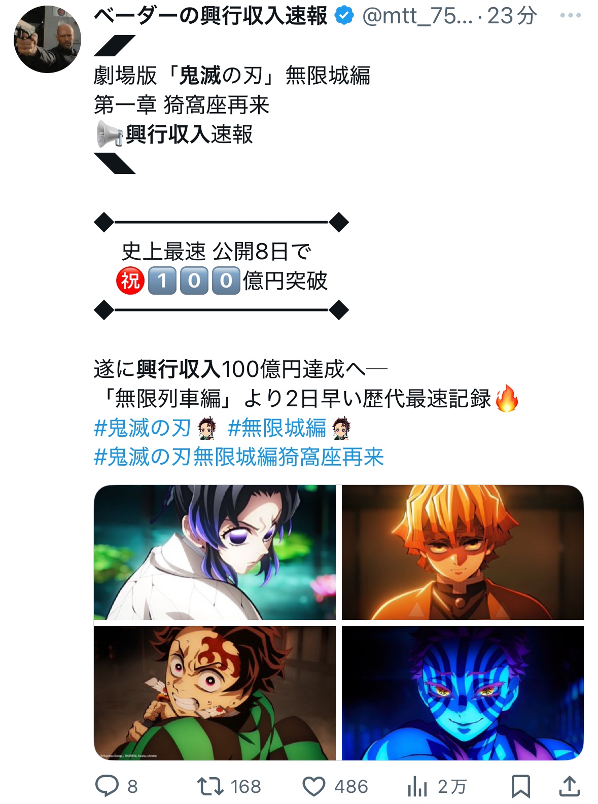 【凄すぎ】鬼滅の刃 無限城編、わずか8日で興行収入100億突破wwwww 2025/7/26 速報 1: https://x.com/mtt_75058/status/1948575265988510179 document.write(” + ”); 関連記事 【速報】鬼滅の刃、公開4日間で興収73億円wwwww 【朗報】鬼滅の刃無限城編興行収入17億円突破、初日成績歴代No.1記録を大幅に塗り替えるwww 【動画】「鬼滅の刃」コスプレの中国女さん、中国人に「お前は中国人だ、何を着てもいい。でも日本の服装だけはダメだ!」と怒鳴られる 【悲報】鬼滅声優さん、想像以上に壮絶な人生を送っていた 【動画】舞台版鬼滅の刃、甘露寺蜜璃さんのシーンを完全再現wwwwww document.write(” + ”); 続きを読む ——— Source: アルファルファモザイク 【凄すぎ】鬼滅の刃 無限城編、わずか8日で興行収入100億突破wwwww