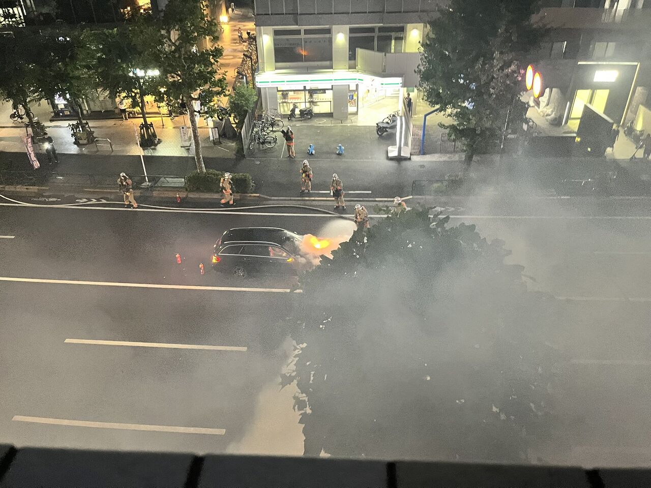 『青梅街道で車燃えてた。中野警察署の前』