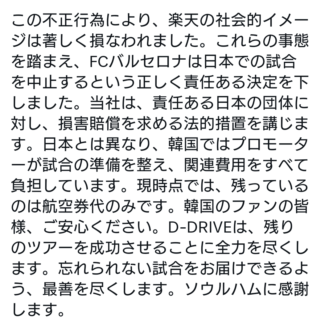 ãèžãŸããFCãã«ã»ããã¯æ¥æ¬ã§ã®è©Šåãäžæ¢ãããšããæ£ãã責任ããæ±ºå®ãäžããŸãããæå®³è³ åãæ±ããããã責任ããæ¥æ¬ã®å£äœã«å¯Ÿãæ³çæªçœ®ãè¬ããŸããæ¥æ¬ãšã¯ç°ãªããéåœã§ã¯ããã¢ãŒã¿ãŒã詊åã®æºåãæŽããé¢é£è²»çšããã¹ãŠè² æ