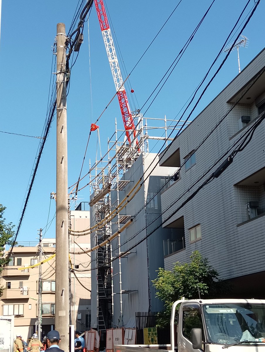 【現場の状況】#停電情報 東京都世田谷区世田谷3丁目付近の工事現場でクレーンが電線引っ掛ける事故 この影響か世田谷区で約1800軒の停電7月29日 #世田谷 #停電 #猛暑