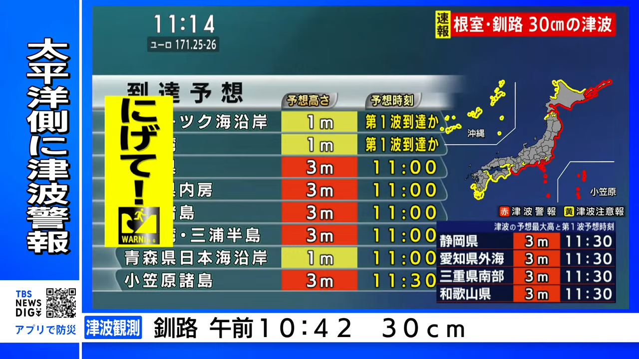 この地震の影響で北海道から東北、関東、東海近畿までの太平洋沿岸の広い地域に津波警報が発表されています。