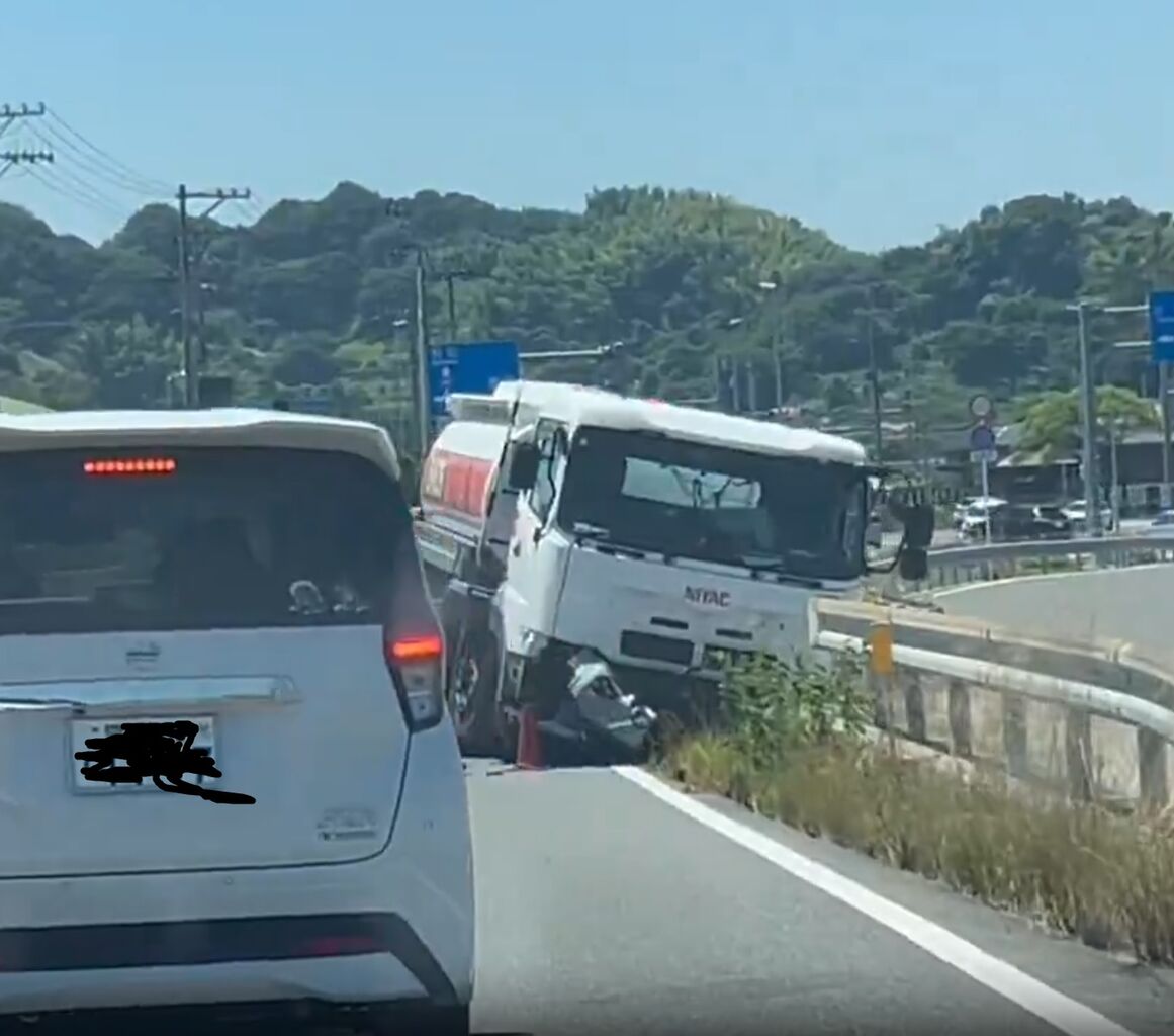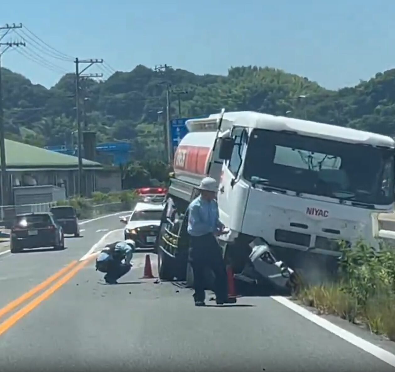 タンクローリーの前側が凹んでるから被害側っぽい?#今治#事故— 月橘 (@mikankujiranoko) August 2, 2025