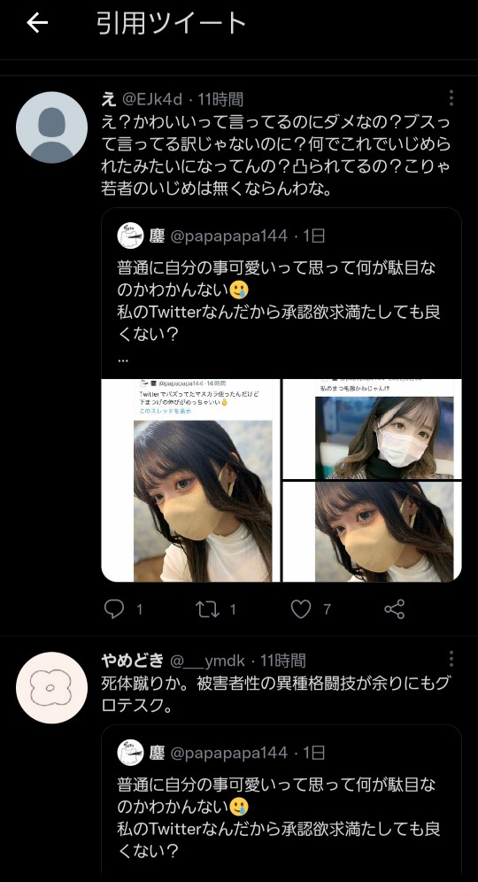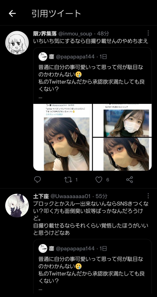 女さんA「自撮り可愛く撮れた」パシャ 女の敵←シュババババ(走り寄ってくる音) 2025/8/4 速報 1: document.write(” + ”); 関連記事 【悲報】宇垣アナ「女の敵は女」って言葉が嫌いだ。提唱し始めたのはきっと男だし」 【女の敵は女】女性さん、子供が作れない身体になってしまい闇堕ちしてしまう マイメロのママの名言「女の敵は、いつだって女」がフェミ間で炎上 マイメログッズが発売中止に document.write(” + ”); 続きを読む ——— Source: アルファルファモザイク 女さんA「自撮り可愛く撮れた」パシャ 女の敵←シュババババ(走り寄ってくる音)