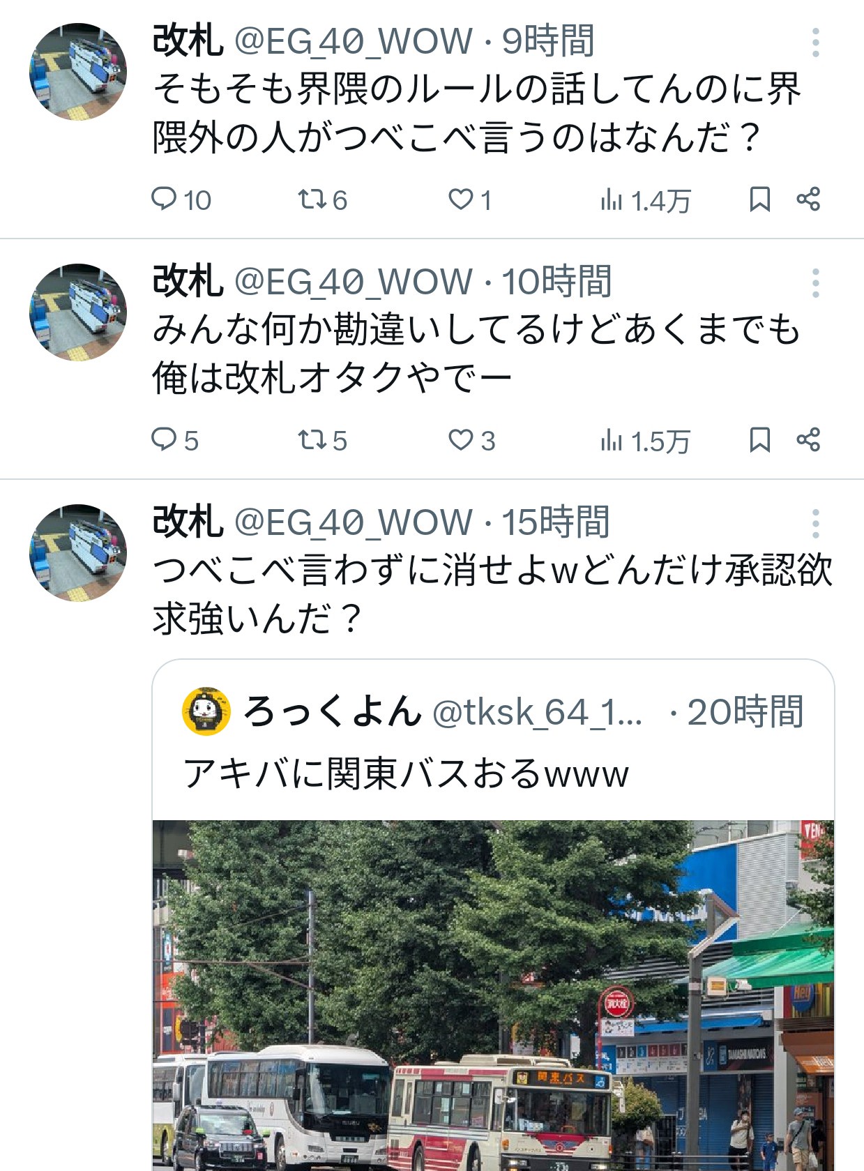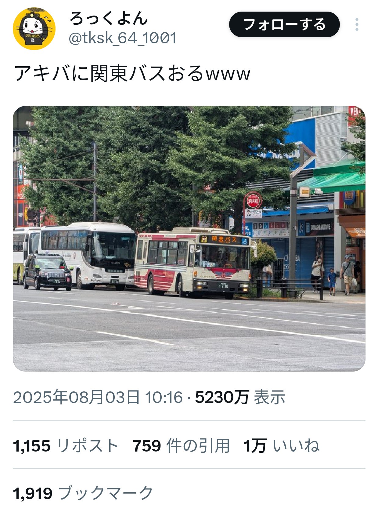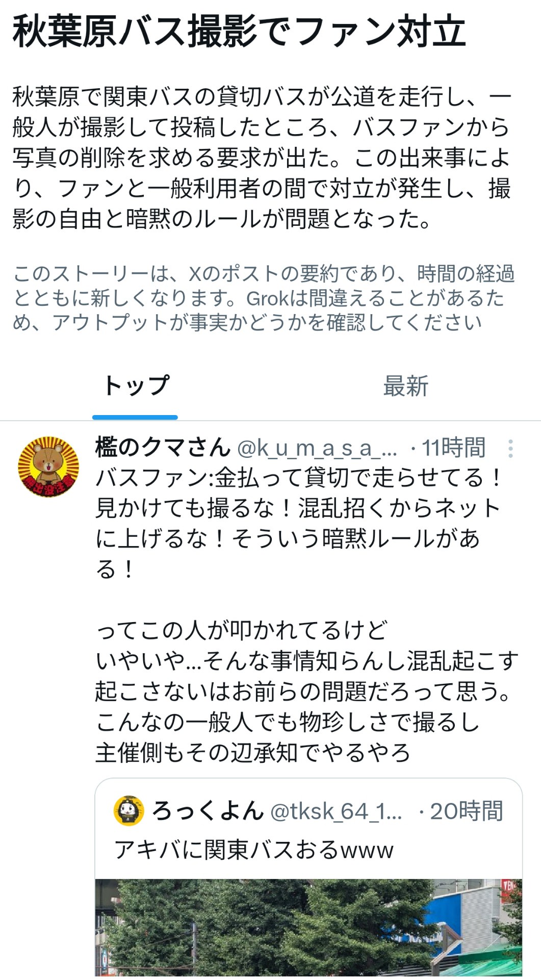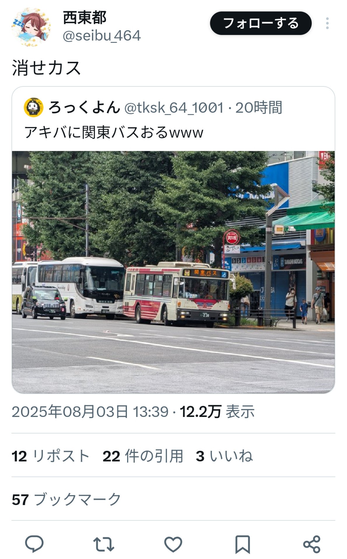 【悲報】X民「アキバに変わったバスがいたw」 バスオタ「消せ消せ消せ消せ消せ消せ」 →炎上してトレンド入りへwwwwwwwww 2025/8/4 速報 1: document.write(” + ”); 関連記事 SNSで何か私見を述べて炎上するパターン多いけど、なんでなん? 【悲報】チコちゃん、炎上。 【悲報】人気女性インフルエンサーさん、パートナーがアイドルへの性加害が発覚し大炎上 【悲報】参政党さん、次は中学生の取材を拒否して炎上 【悲報】共同通信「クイズです。タイとカンボジアの軍事衝突、先に攻撃したのはどっち?」→ 大炎上 document.write(” + ”); 続きを読む ——— Source: アルファルファモザイク 【悲報】X民「アキバに変わったバスがいたw」 バスオタ「消せ消せ消せ消せ消せ消せ」 →炎上してトレンド入りへwwwwwwwww
