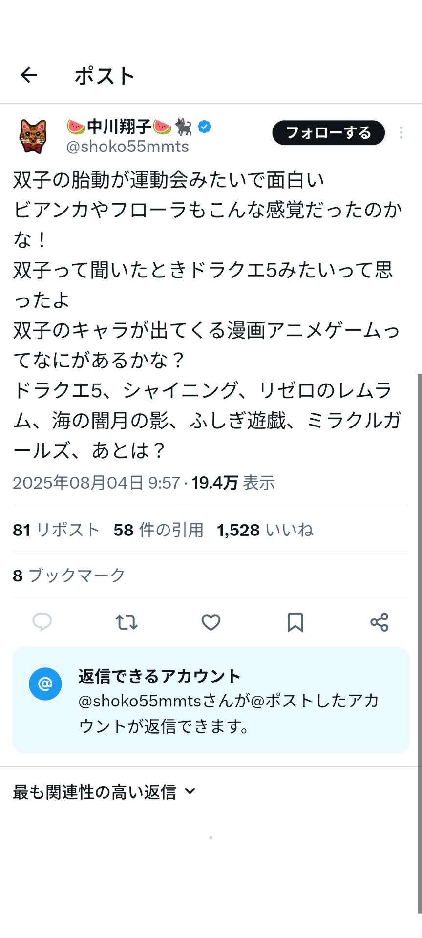 【朗報】中川翔子さん、無事通常運転「双子ってドラクエ5みたい」 2025/8/5 速報 1: https://x.com/shoko55mmts/status/1952172019052904785 document.write(” + ”); 関連記事 【悲報】中川翔子さん、言わなかったけど実は2回流産してた。 【画像】中川翔子さん(40)、マタニティーフォトを大公開 wwwww 【画像】新婚の中川翔子さん、幸せな日常を公開 【速報】中川翔子さん、産休に入る 【疑問】中川翔子の例の騒動、嘘でもいいから適当に一言謝るだけで一瞬で炎上止んだのに document.write(” + ”); 続きを読む ——— Source: アルファルファモザイク 【朗報】中川翔子さん、無事通常運転「双子ってドラクエ5みたい」