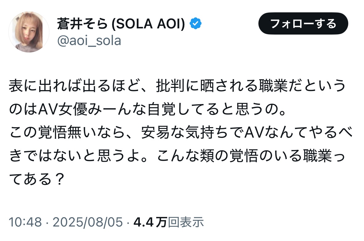 【最強】レジェンド女優さん「表に出れば出るほど、批判に晒される職業だという覚悟がないならAVなんてやるな」 2025/8/6 速報 1: 開示か? document.write(” + ”); 関連記事 【画像】仲里依紗さん(35)、うっかり目立ちすぎるドレスを着てしまうwwwwww【pickup】 【画像】仲里依紗さん(35)、うっかり目立ちすぎるドレスを着てしまうwwwwww 【悲報】セクシー女優「え待って、一般人って純白のウェディングドレス着れば純潔に戻れるって思ってんの?」 【悲報】三上悠亜ウェディングドレス騒動、遂に未婚男性まで叩かれ始めるwwwwwwwwwwwwwwwwww 【悲報】セクシー女優さん、ウェディングドレスのモデルをして叩かれまくってしまう document.write(” + ”); 続きを読む ——— Source: アルファルファモザイク 【最強】レジェンド女優さん「表に出れば出るほど、批判に晒される職業だという覚悟がないならAVなんてやるな」