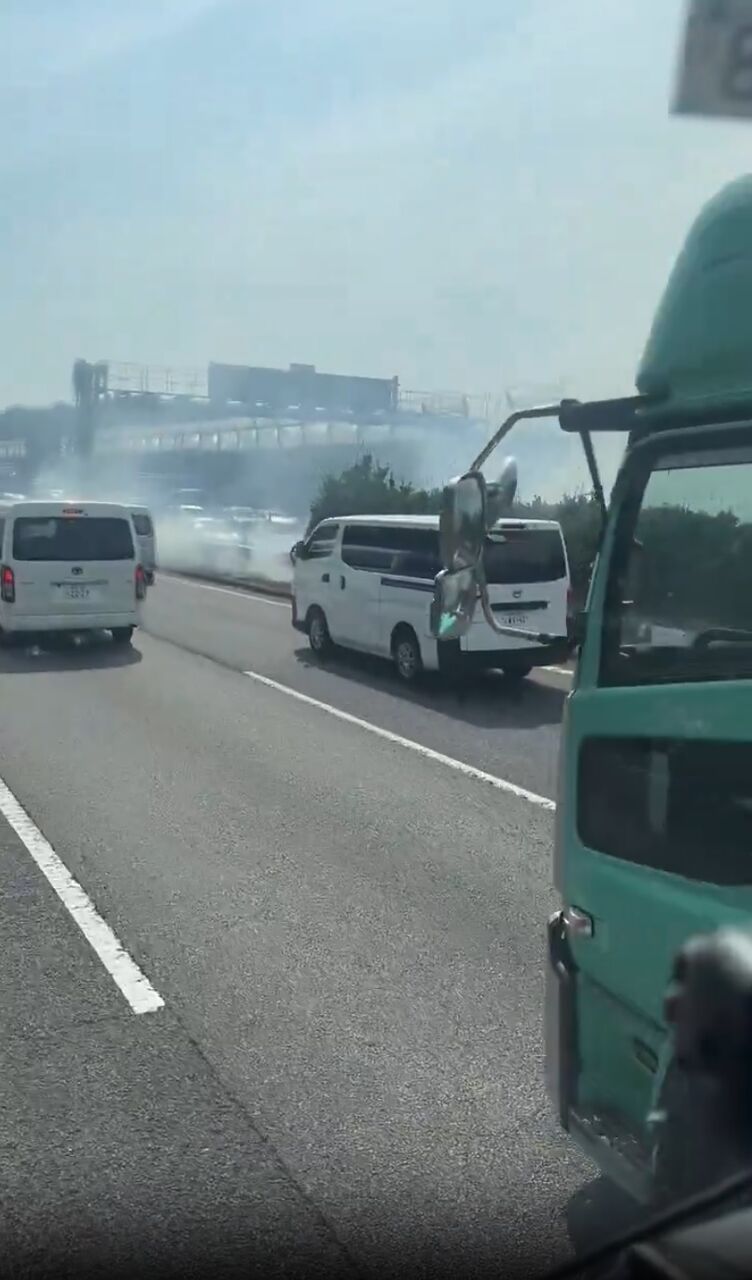 『圏央道から東名に入って東京方面にしばらく走ったあたり…海老名SAの先くらい…でやたら煙がモクモク…