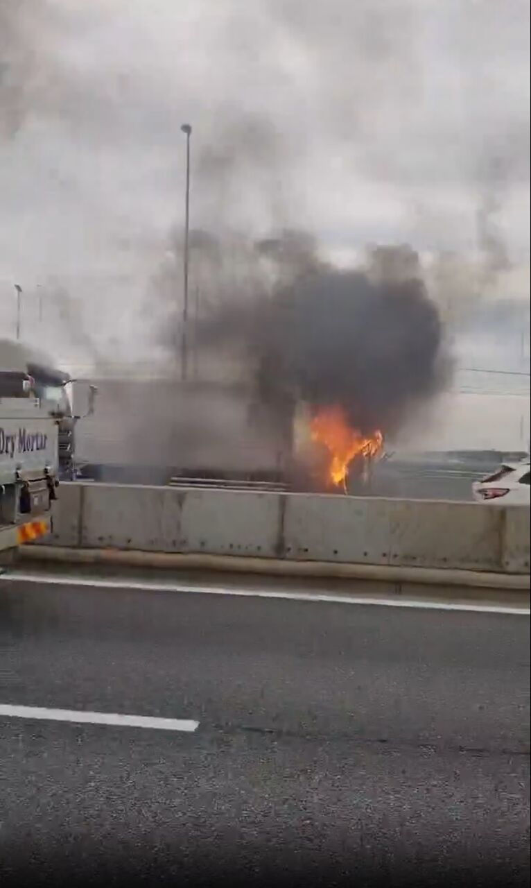 東関道、葛西と新木場の間でトラック燃えてるーボンボン爆発してるー
