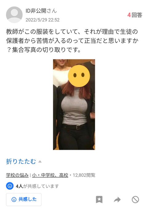 【画像】女教師さん、服装が理由で生徒の保護者から苦情が来てしまう… 2025/8/13 速報 1: 地味目な服装なのに… document.write(” + ”); 関連記事 【物議】テレ朝アナ「SNSの“何気ない投稿”で高校球児の夏が終わる」 ←被害者保護者への配慮が足りないと批判の声 弁護士さん、広陵高で部員・保護者から意見なし 「反論なかったのを良しとしてるが、そうではなく」「言いたい事たくさんあると思う」 広陵野球部保護者会に250人出席も誰1人質問せず30分で終了wwwwwwwwwwwwwwwwwwww 【悲報】スマホ使った高校球児さん、顧問にブチギレられ退部→保護者「住民監査請求します」 【速報】小学校教室に男2人が侵入・窓ガラス割る → 保護者の友人だった document.write(” + ”); 続きを読む ——— Source: アルファルファモザイク 【画像】女教師さん、服装が理由で生徒の保護者から苦情が来てしまう…