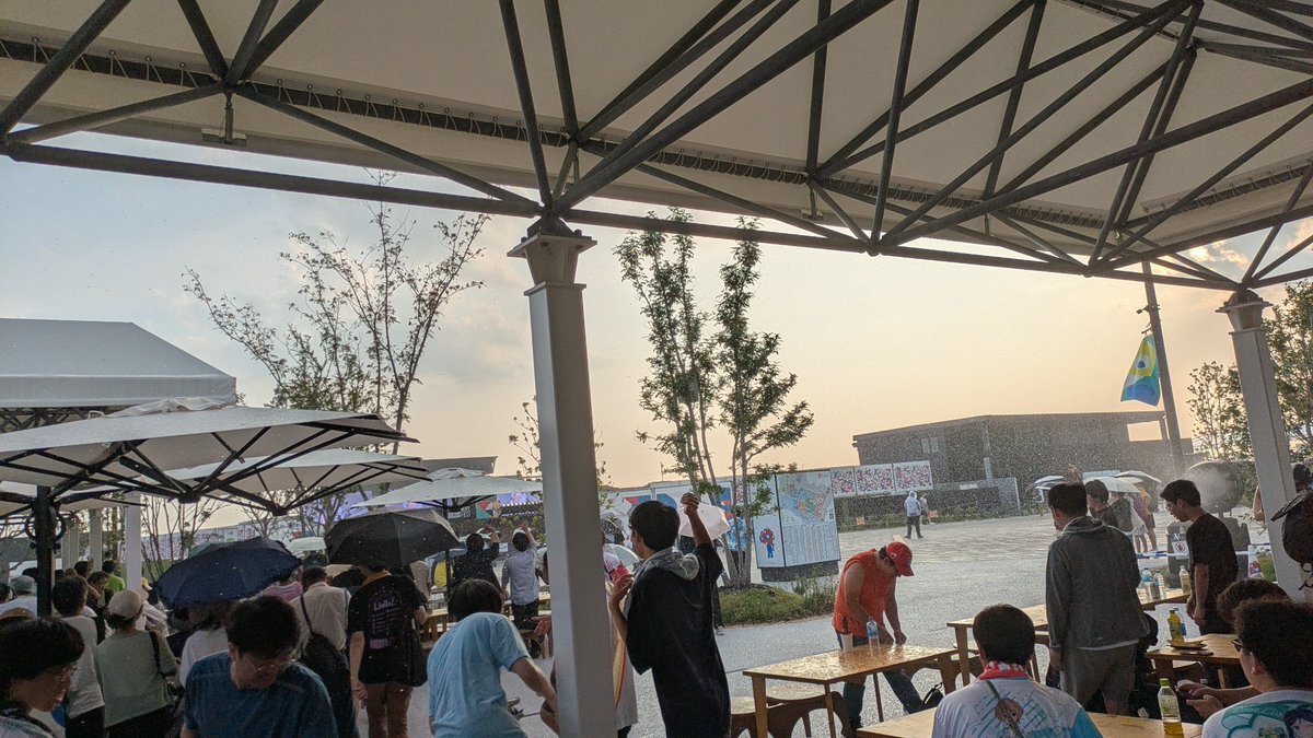 万博ラブライブ、特撮みたいな雨降ってきて中断中