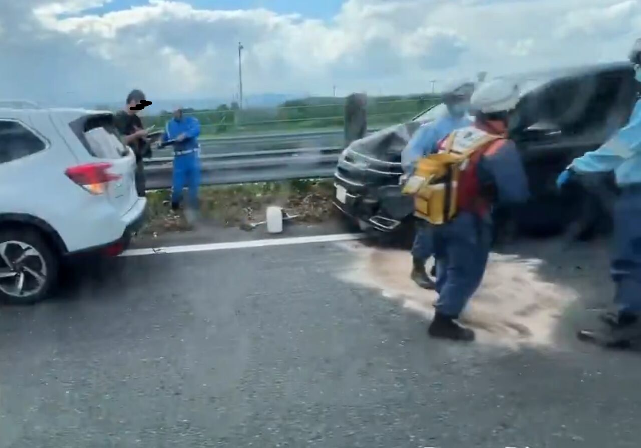 坂戸西出口手前上りで玉突き事故… pic.twitter.com/YmMZhP3UYI