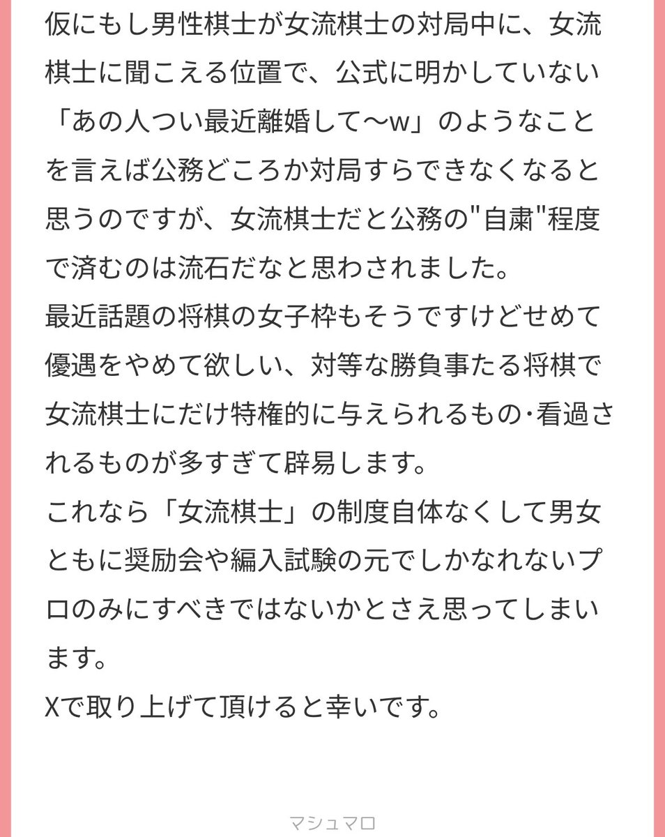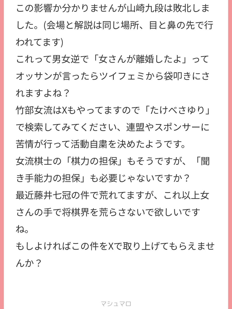 【炎上】女流棋士「これ非公開情報なんですけど、山崎九段離婚してるんですよね~w」(大勢の見てる前で、山崎九段もいる場所で暴露) 2025/8/18 速報 1:名無しさん@おーぷん 女流棋士「これ非公開情報なんですけど、山崎九段離婚してるんですよね~w」(大勢の見てる前で、山崎九段もいる場所で暴露) ↓ 山崎九段、急に失速し敗北 ↓ 女流棋士大炎上 — (@3f9xxmf5o719520) ↓↓↓ — (@3F9XXmF5o719520) ↓↓↓ — (@3F9XXmF5o719520) ↓↓↓ — (@3F9XXmF5o719520) document.write(” + ”); 関連記事 【炎上】フェミさん、幼少期に将棋センターで「対戦」後に性被害に遭ったと告白wwwwwwwwwwwwww 【まんばず】女さん「藤井聡太を女にして人生やり直させてみたいw将棋センターでジジイに絡まれて終わりだろw」 【まんばず】女さん「藤井聡太が将棋界への女性参入を阻止してるのは、昔女性にボロ負けしたからその恨み」 将棋で女のプロ棋士が出てこない理由、誰にも分からない 将棋AI「あれ?先手で勝率が7割超えたわ。先手ゲーじゃね?」 document.write(” + ”); 続きを読む ——— Source: アルファルファモザイク 【炎上】女流棋士「これ非公開情報なんですけど、山崎九段離婚してるんですよね~w」(大勢の見てる前で、山崎九段もいる場所で暴露)