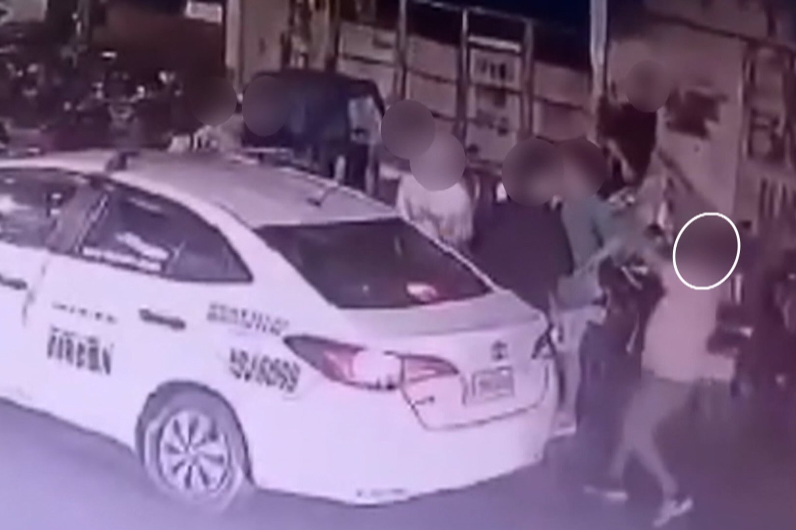 防犯カメラの映像では、白いタクシーが止まり、人が降りてきます。次の瞬間、人が倒れたように見え、周囲の人々が逃げ出しました。さらに、バイクに乗った2人組が走り去る様子が捉えられています。