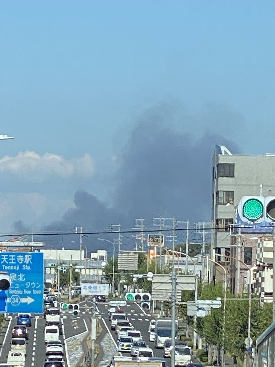 『堺市北区金岡団地に居てるけど、煙が見える。火事のサイレンも大泉緑地あたりかな?』