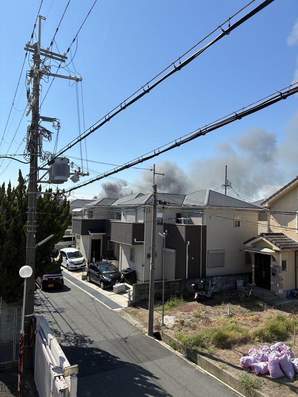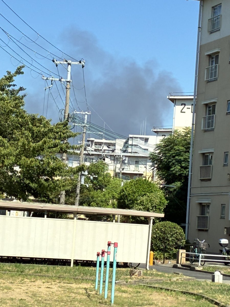堺市北区金岡団地に居てるけど、煙が見える。火事のサイレンも