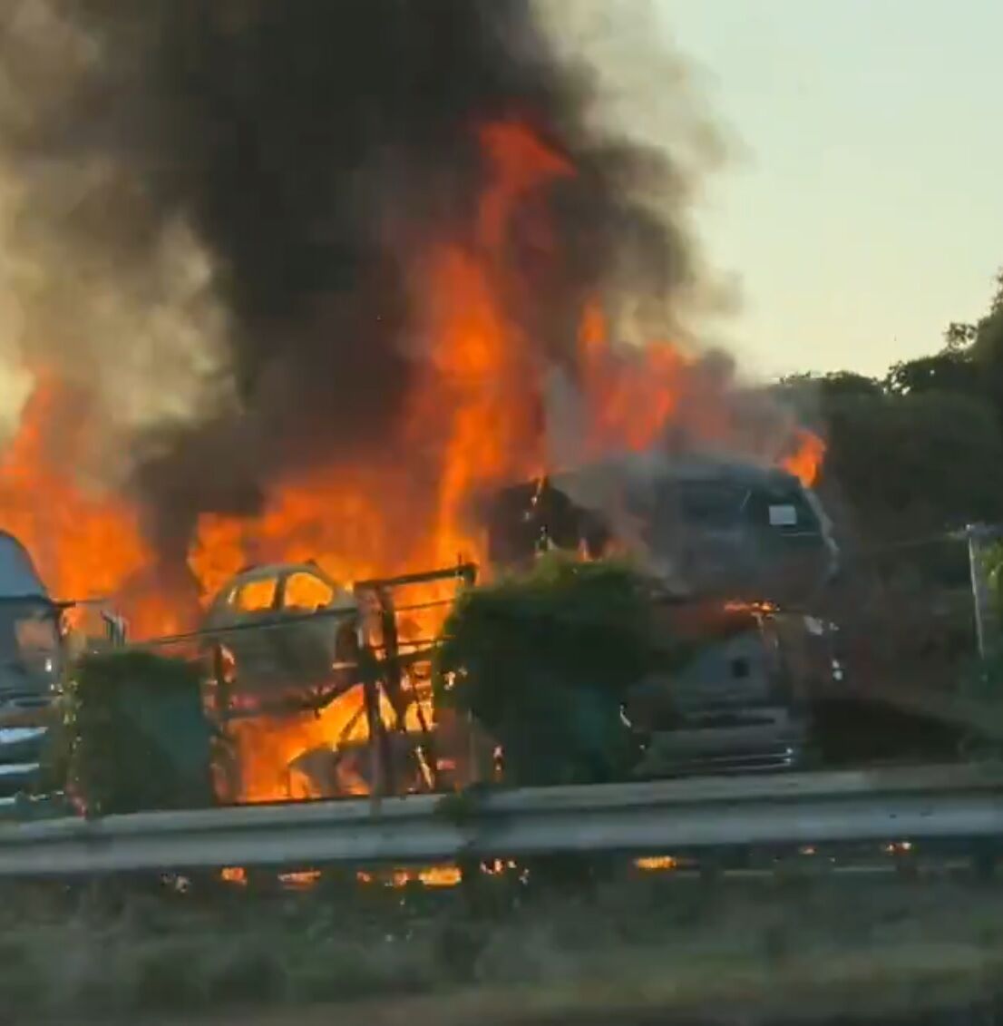 東名高速静岡IC過ぎたあたりで、キャリアカーが大炎上してました