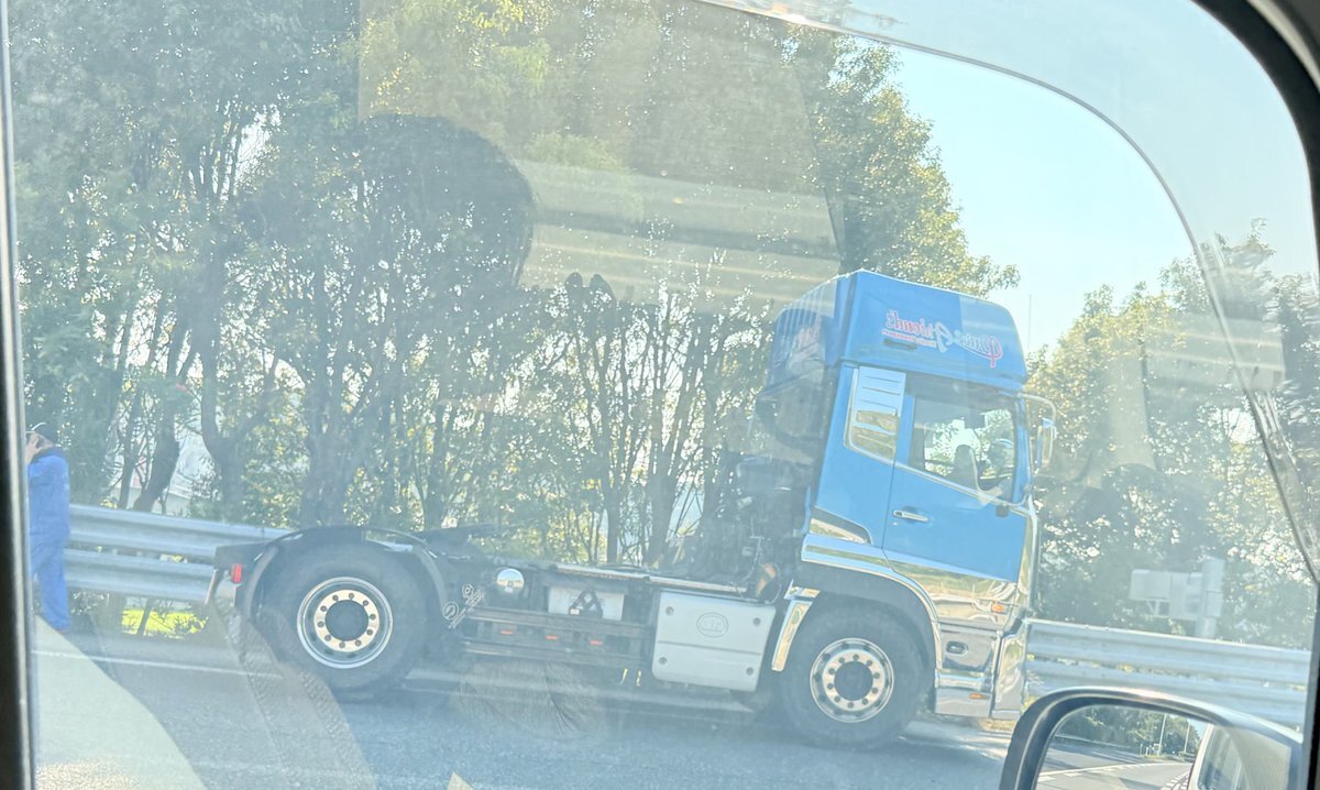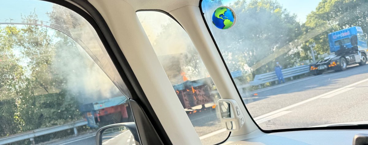 東名高速下り、美合SAの2㌔手前でトレーラー火災