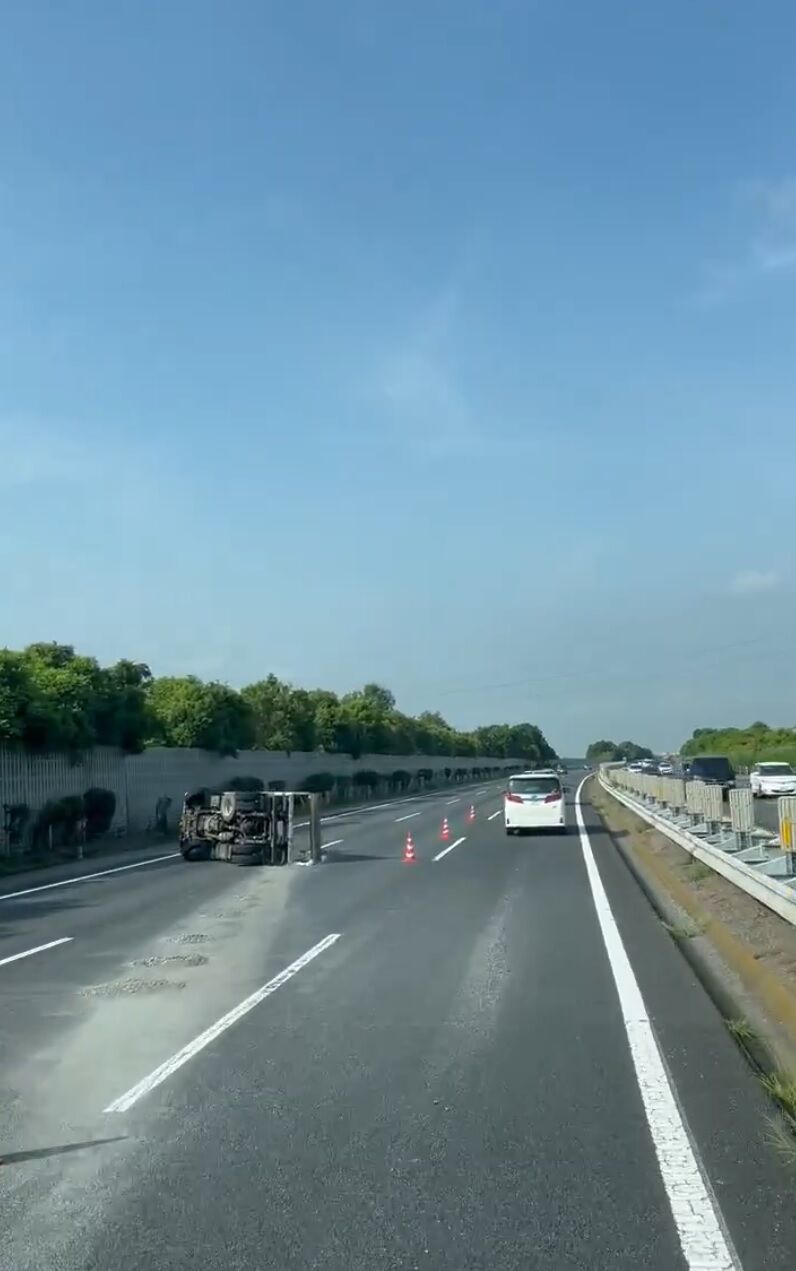 朝からトラックが横転して一時2車線塞ぐ事故が発生している模様