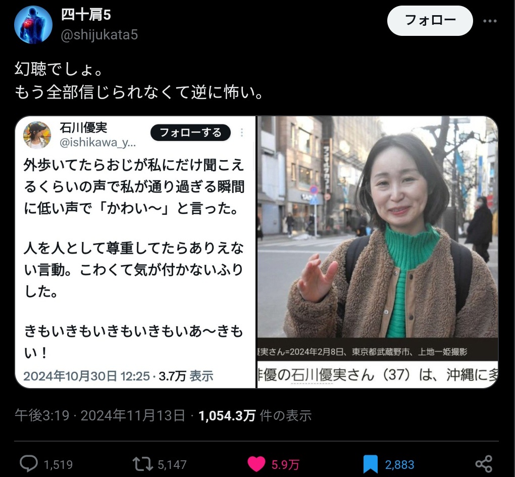 【画像】大物フェミニスト「通りすがりのおじさんに可愛いって言われた」「きもいきもいきもいきもいあ〜きもい!」 2025/8/26 速報 1: 外歩いてたらおじが私にだけ聞こえるくらいの声で私が通り過ぎる瞬間に低い声で「かわい~」と言った。 人を人として尊重してたらありえない言動。こわくて気が付かないふりした。 きもいきもいきもいきもいあ〜きもい! document.write(” + ”); 関連記事 【炎上】カードキャプターさくら、フェミニストに見つかり炎上wwwwwwwwwwwwwwwwwwww 【議論】フェミさん「女子枠がない世界で女がどれだけ生きづらかったか考えたことありますか!?」 フェミさん「私の媚びない発言を怖がる男、普段どんだけ女に甘やかされてんの?」 【まんばず】フェミさん「痴漢が起きるたびに非常用停止ボタン押して乗客全員巻き込むようにしたら爆速で対策されるのでは!?」 【悲報】フェミの炎上、「無視すればいい」という風潮が広まってしまうwwwwww document.write(” + ”); 続きを読む ——— Source: アルファルファモザイク 【画像】大物フェミニスト「通りすがりのおじさんに可愛いって言われた」「きもいきもいきもいきもいあ〜きもい!」