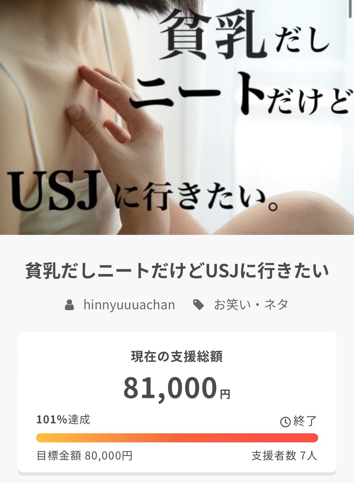 【悲報】女さん「ニートだけどUSJいきたい」クラファン開始 2025/8/27 速報 1: https://camp-fire.jp/projects/52599/view/activities document.write(” + ”); 関連記事 【朗報】女だけの街をつくるクラファン、資金が続々と集まる 【緊急速報】女性だけの街を作るクラファン、始まる → 内容がヤバすぎると話題にwwww 余命2カ月の末期癌公表→クラファンで4500万円集める→翌月死去のBDレフェリー、亡くなる2週間前の様子 【衝撃事実】すい臓がんステージ4YouTuber、クラファンにより全てを失う 【緊急】ガッツchクラファン支援者さん全額没収により逝く document.write(” + ”); 続きを読む ——— Source: アルファルファモザイク 【悲報】女さん「ニートだけどUSJいきたい」クラファン開始