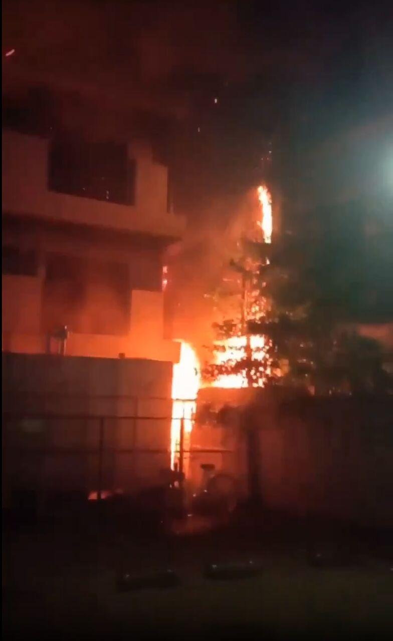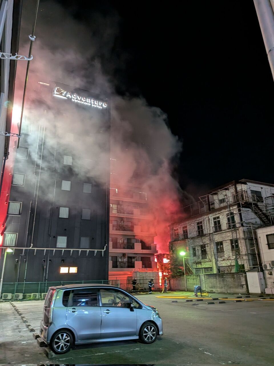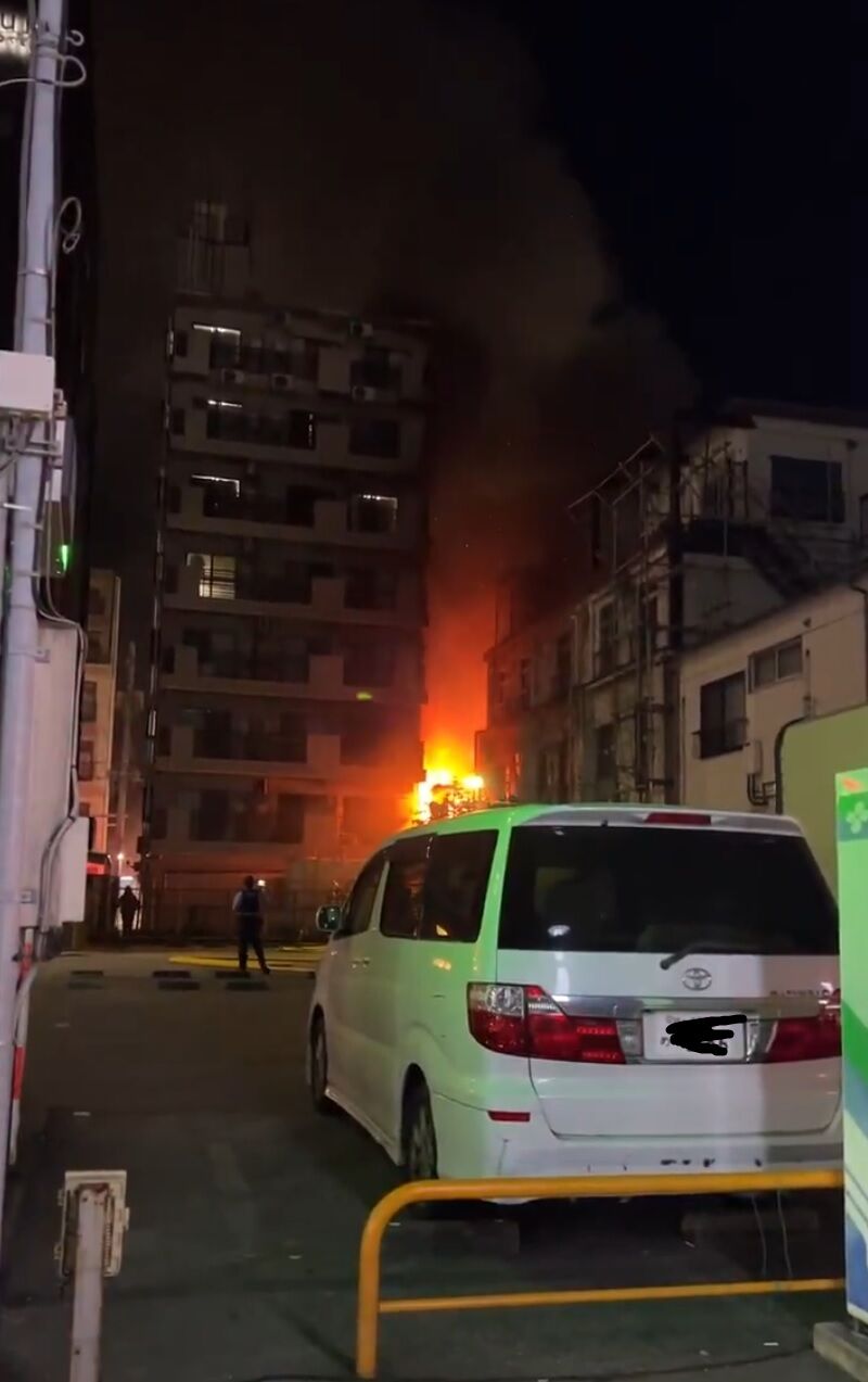 『栄町にある古い方のセブンイレブン裏手側、大規模な火災中