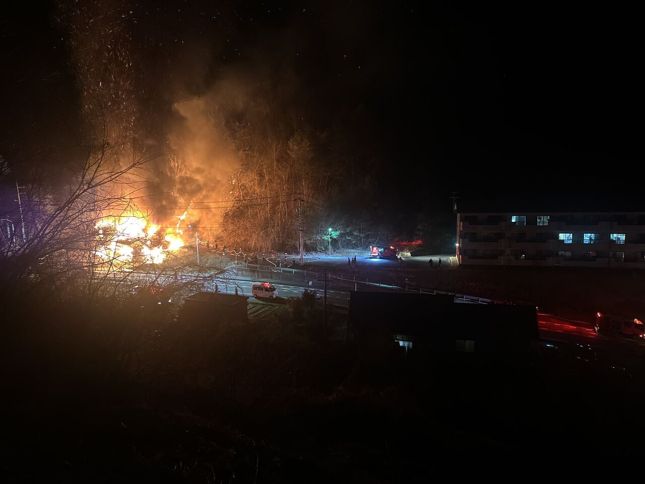 下條村睦沢 小松原隧道付近から建物火災が発生しました。