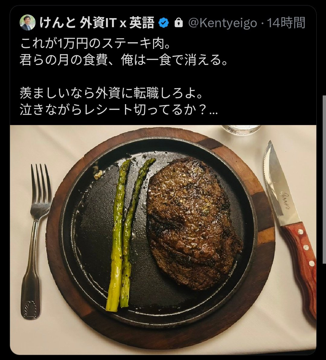 【画像】外資エリートさん、1万円ステーキをドヤ顔で晒すも庶民の自炊に完全敗北してしまうwww 2025/9/1 速報 1: @ 食事エアプすぎて人間の食費を月1万円だと思ってて面白い https://x.com/kkun414/status/1961694352889319538 document.write(” + ”); 関連記事 【動画】アメリカのステーキハウス、レベチwwwww 【画像】レア豚ステーキ専門店、うまそうすぎるwwwwwwwww 【画像】いきなりステーキが始めたすき焼き屋、我々の想像を超えてくる。。。 【画像】女「今夜はステーキ焼くね♡」 AI「いきなりステーキか…まぁこんな感じやろ」→ document.write(” + ”); 続きを読む ——— Source: アルファルファモザイク 【画像】外資エリートさん、1万円ステーキをドヤ顔で晒すも庶民の自炊に完全敗北してしまうwww