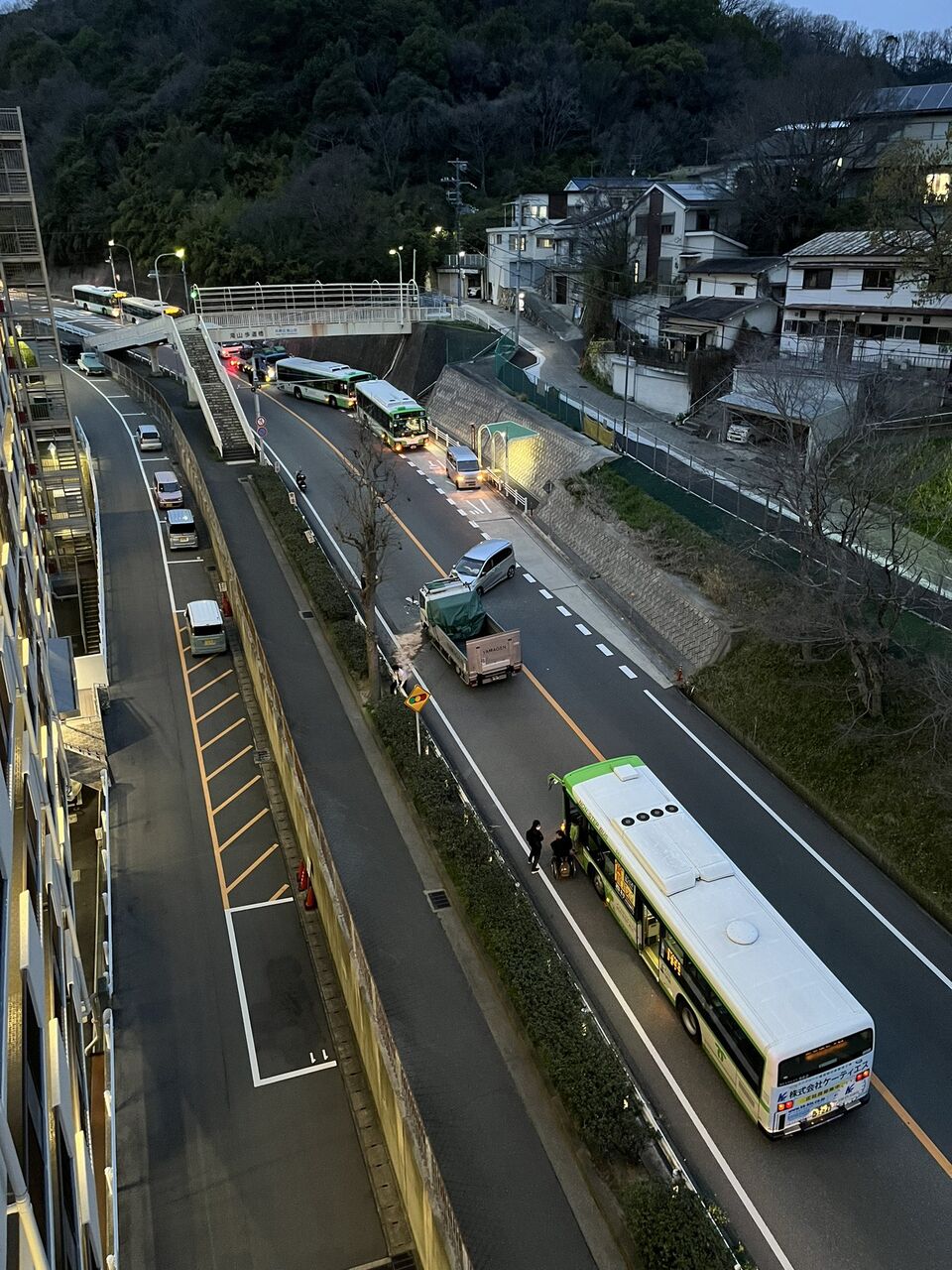 【現場の様子】#交通情報 夢野白川線 兵庫県神戸市兵庫区滝山町歩道橋付近トラックと自動車衝突事故で規制渋滞 神戸市バス遅延3月31日 #渋滞 #神戸 #兵庫区 #年度末