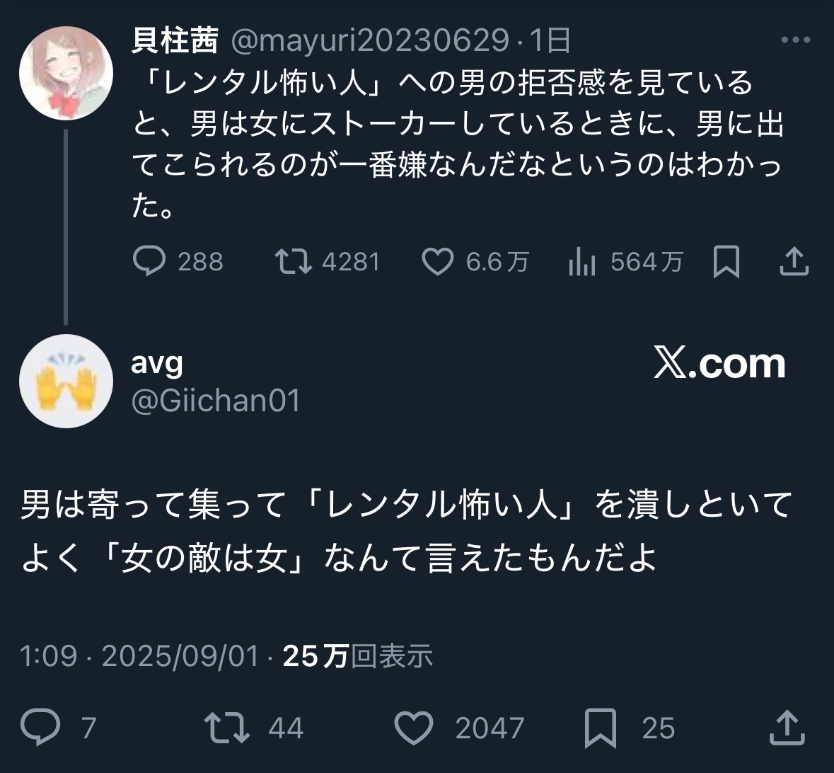 【悲報】「レンタル怖い人」サービス終了→なぜか「男が潰した!女の敵!」という認識で世間に広まる 2025/9/2 速報 1: document.write(” + ”); 関連記事 【悲報】「レンタル怖い人」、ガチの怖い人が来てしまいサ終してしまうwww 【速報】『レンタル怖い人』、早速逝くwwwwwwwwwwwwwwwwwwwwwwwwwwwww 【レンタル怖い人】どんな怖い人が来るんか気になったけ調べたらこれでガチで草www 【悲報】「レンタル彼氏」とんでもない“真実”が明らかになる 【悲報】レンタル彼女、闇が深すぎる document.write(” + ”); 続きを読む ——— Source: アルファルファモザイク 【悲報】「レンタル怖い人」サービス終了→なぜか「男が潰した!女の敵!」という認識で世間に広まる