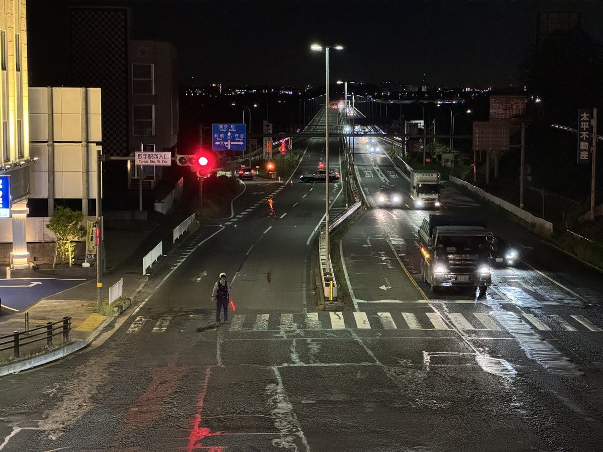 国道6号上り取手〜我孫子間にてダンプ横転につき通行止め。