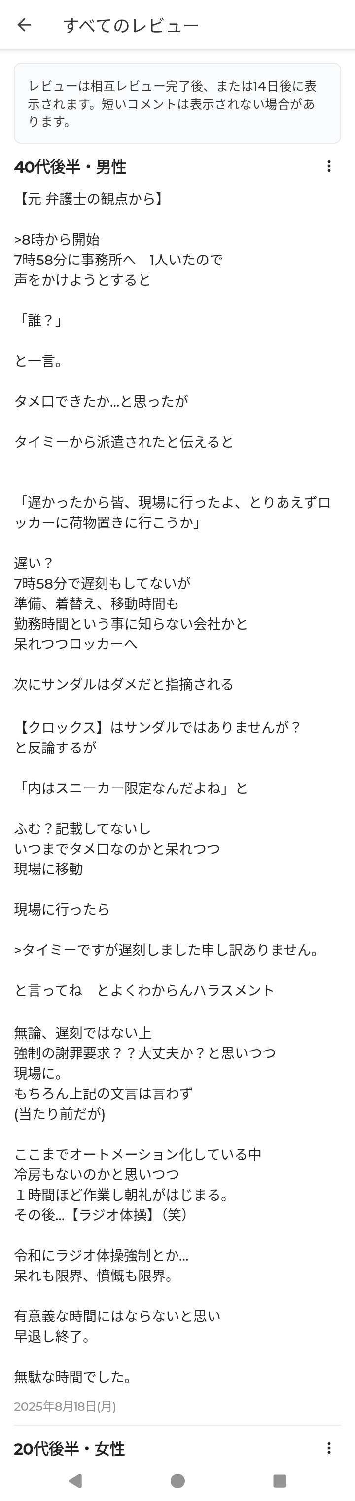 【悲報】タイミーに潜入した弁護士、あまりに底辺ブラック過ぎて憤慨し途中で帰宅してしまう 2025/9/3 速報 1: ・仕事の準備も勤務時間に含まれることを知らない社員たち ・勤務時間に準備を始めたら遅刻扱いにされて謝罪を強制される ・ずっとタメ口 ・朝礼後に謎のラジオ体操をやらされ、とうとうブチ切れて帰る document.write(” + ”); 関連記事 【朗報】タイミーの募集欄で短編小説を書く雇用主が現れるwwwwwwwwwwwwwwwwwwww 【炎上】たこ焼き屋「タイミーの奴が開始3分前に来たので帰らせた」 ←労働基準法違反ではないかと話題に タイミーの“知らない人とちょっと仲良くなる”感覚、わかる奴おる? 【悲報】タイミーさん、古いiPhone勢を切り捨ててしまい路頭に迷うワーカー続出 【悲報】タイミー「SNSに画像あげんなよ」 document.write(” + ”); 続きを読む ——— Source: アルファルファモザイク 【悲報】タイミーに潜入した弁護士、あまりに底辺ブラック過ぎて憤慨し途中で帰宅してしまう