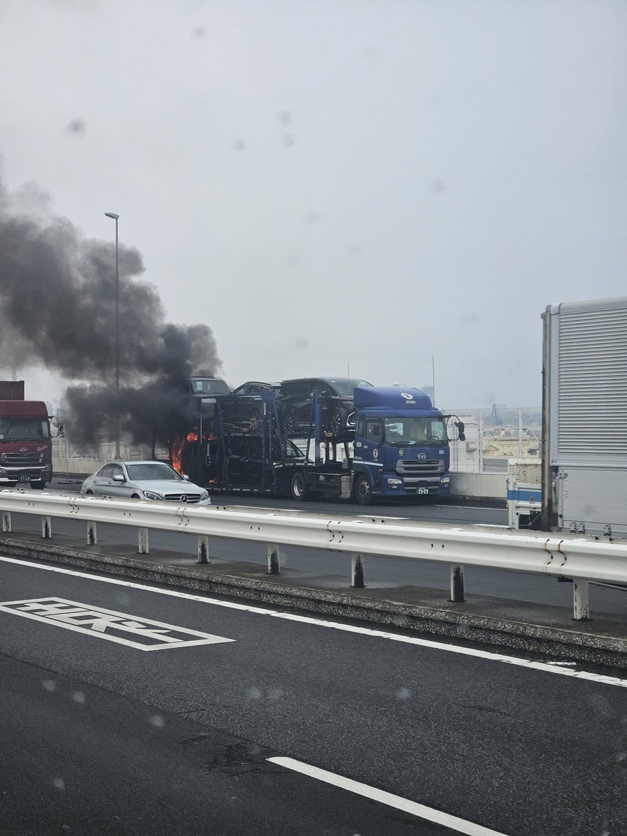 湾岸線東行の大黒JCTでトレーラー燃えてる pic.twitter.com/zAeTawnx27