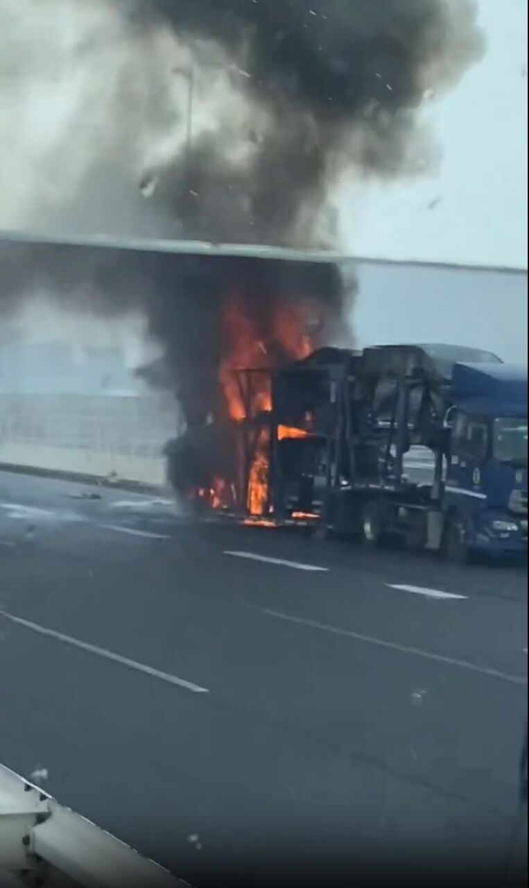 『湾岸線東行の大黒JCTでトレーラー燃えてる』