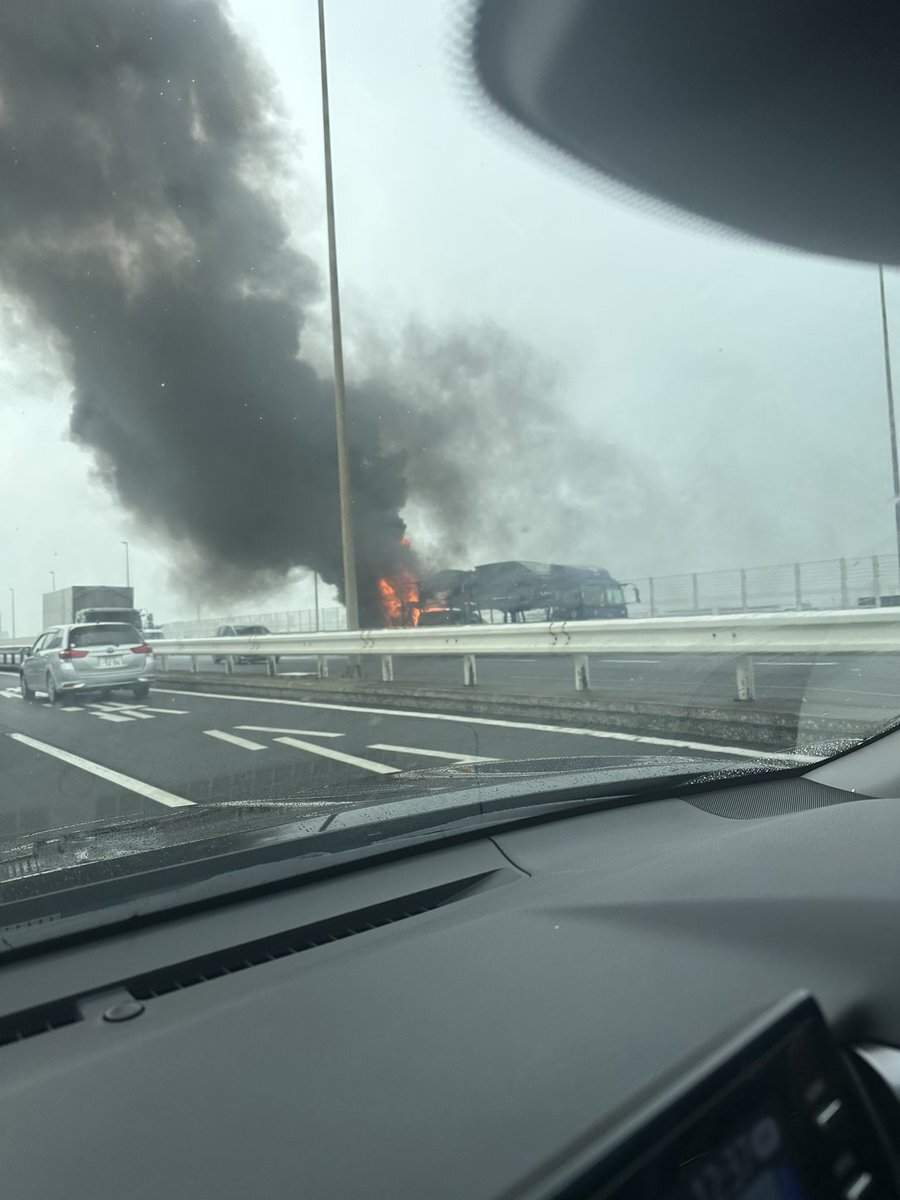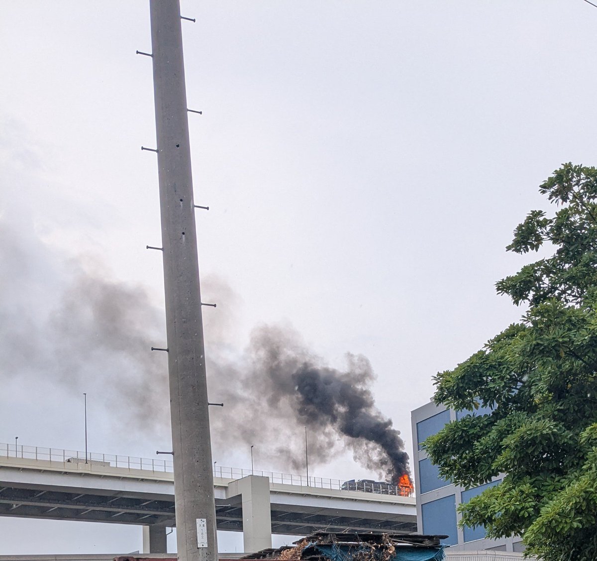 【現場の様子】#交通情報 首都高神奈川5号大黒線 下り 大黒JCT付近 キャリアカー燃える車両火災事故で通行止め渋滞9月4日 #首都高 #大黒線 #湾岸線 #火災