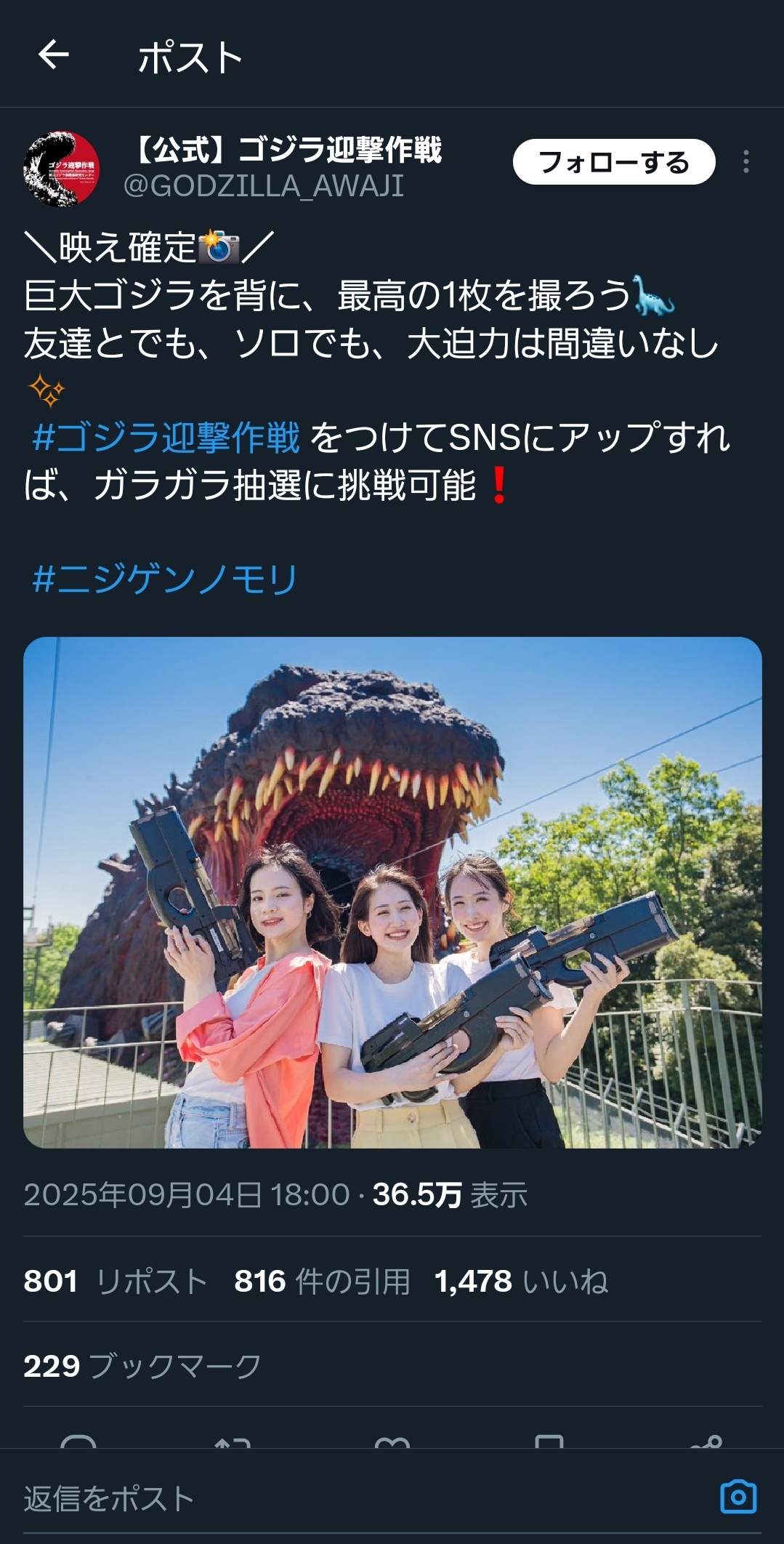 【画像】女の子「あっゴジラだ、写真撮ろ!(パシャ)」 チー牛(エッホエッホ ツタエナキャ) 2025/9/5 速報 1: https://x.com/GODZILLA_AWAJI/status/1963527458562392500 ↓↓↓ — (@HaishinPa) document.write(” + ”); 関連記事 ワイ「ゴジラ-1.0凄かったな…ついでにシン・ゴジラも見てみるか」 【ネタバレ注意】ゴジラ-1.0みたんやが神木隆之介の叫びがゴジラよりうるさすぎる 【悲報】アマプラでゴジラ-1.0見たらめっちゃ後悔した… 【悲報】アメリカ人「ゴジラ-1.0見たけど、正直な感想言っていい?」 【ネタバレ注意】『ゴジラ-1.0』の評価、『シン・ゴジラ』以下の評価に落ち着いてしまう document.write(” + ”); 続きを読む ——— Source: アルファルファモザイク 【画像】女の子「あっゴジラだ、写真撮ろ!(パシャ)」 チー牛(エッホエッホ ツタエナキャ)