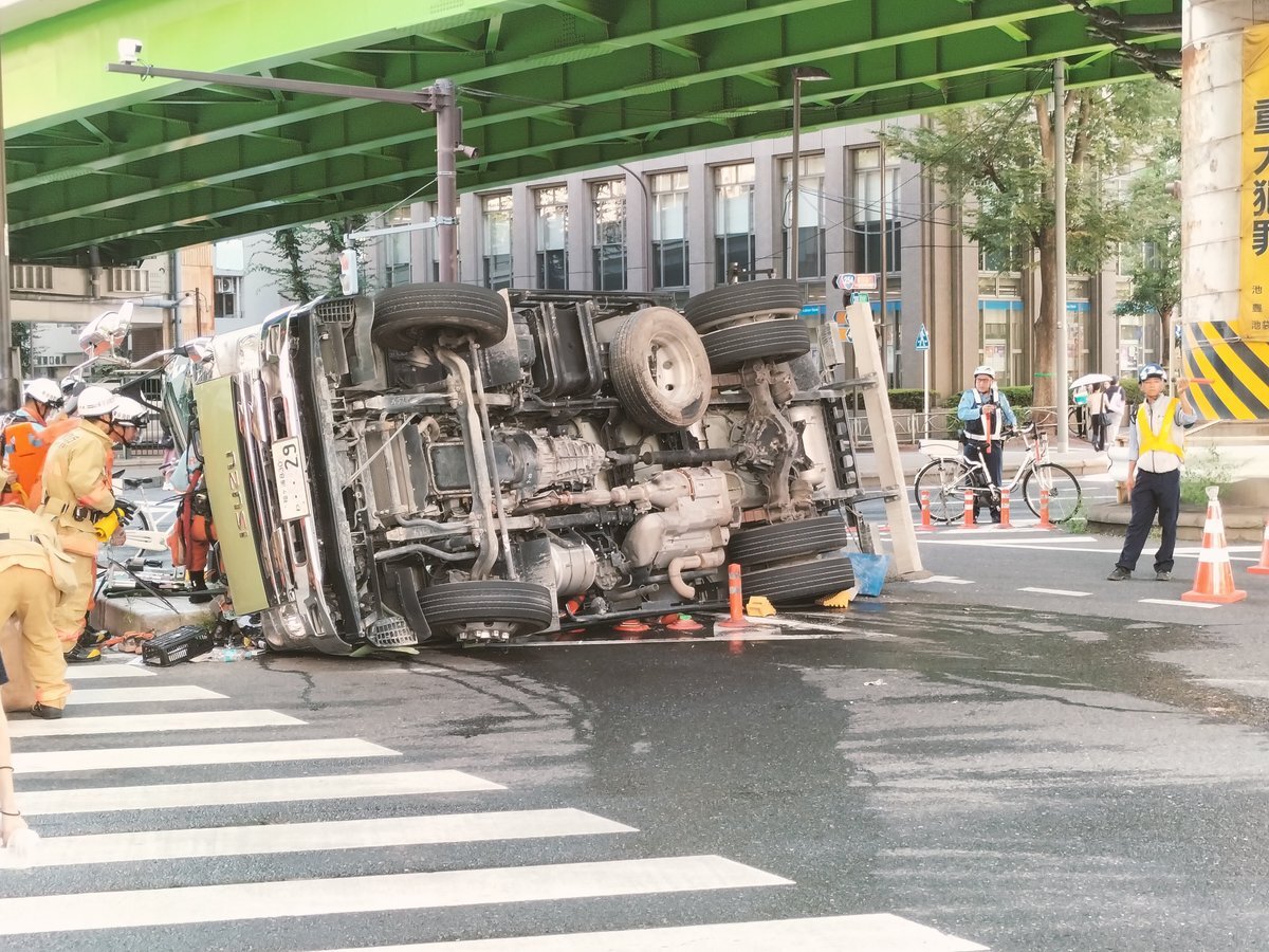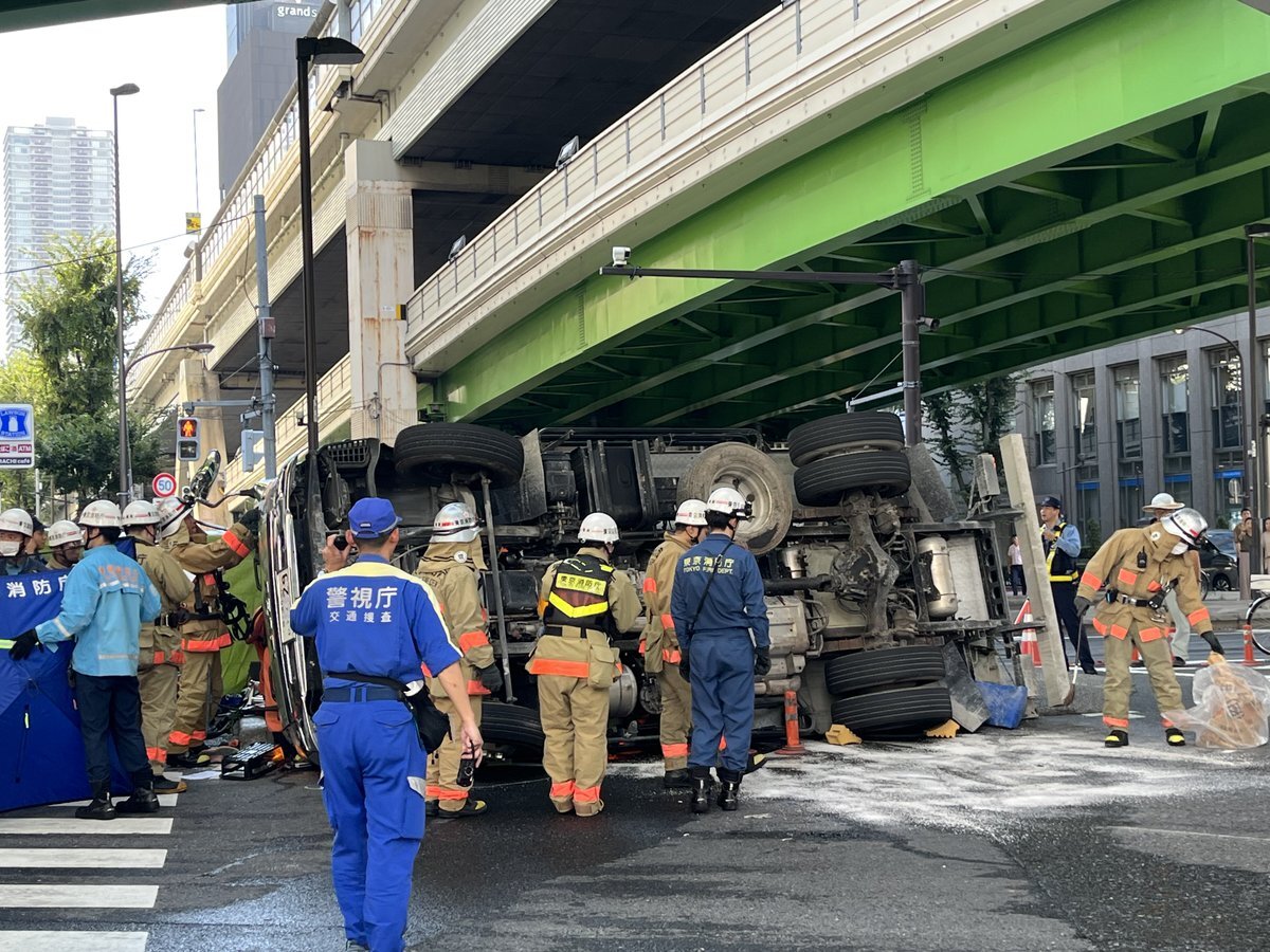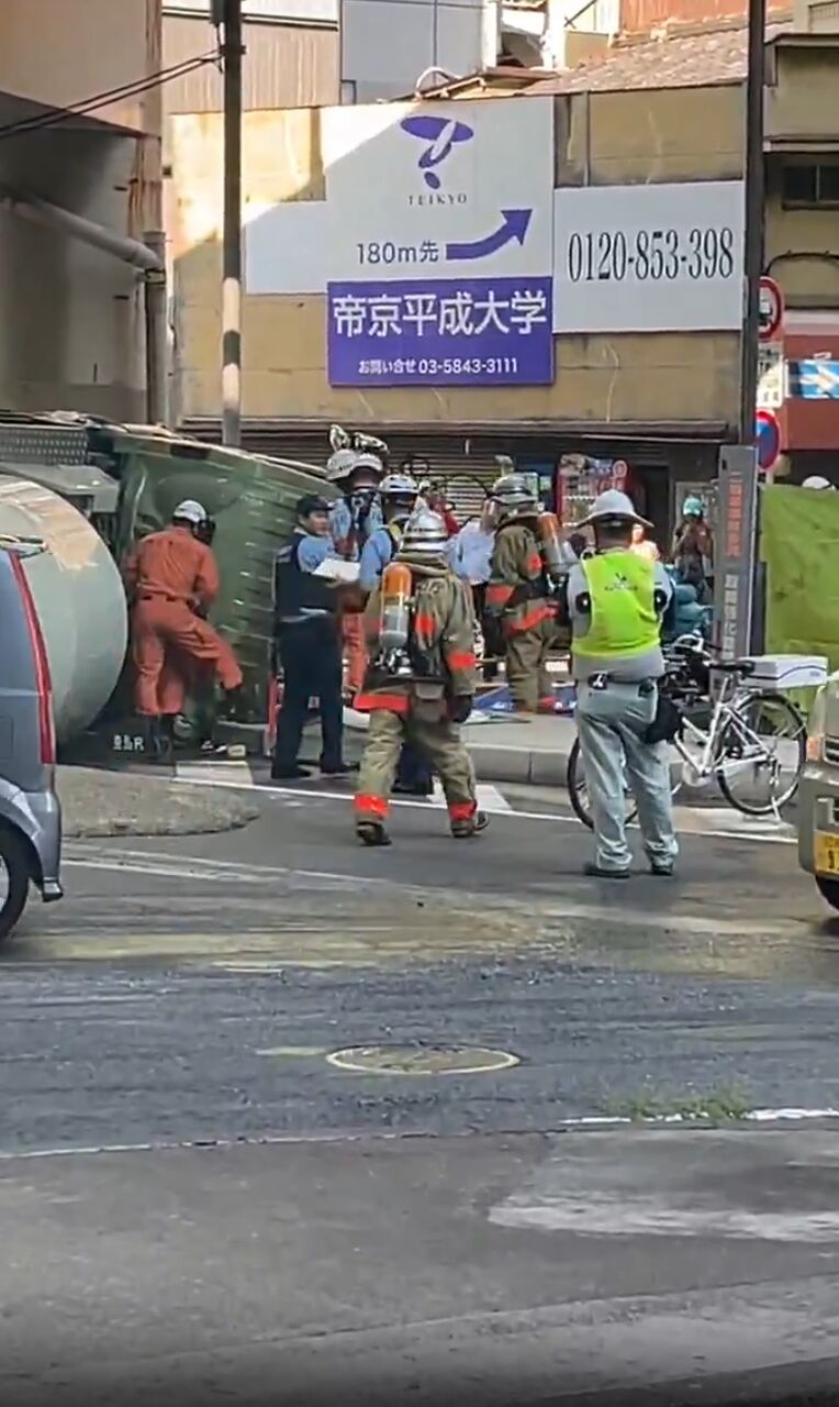 『池袋の五叉路でトラックが横転してる。事故ったばっかりっぽくて警察と消防と野次馬がどんどん集まってる』