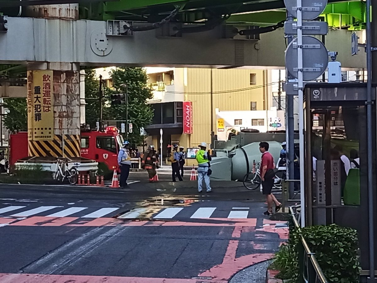 なんか騒がしいので外出てみたがミキサー車が横転してる pic.twitter.com/yh26mh5ALy
