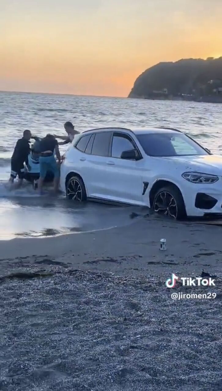 夢庵前の砂浜で水上バイクを引き上げようとしたなにわナンバーのBMW X1?X3?がスタック。