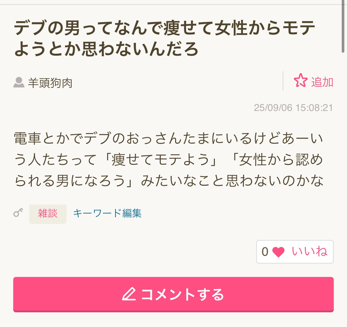 女さん「デブの男ってなんで痩せて女性からモテようと思わないの?」 2025/9/8 速報 1: デブの男ってなんで痩せて女性からモテようとか思わないんだろ 羊頭狗肉 25/09/06 15:08:21 電車とかでデブのおっさんたまにいるけどあーいう人たちって「痩せてモテよう」「女性から認められる男になろう」みたいなこと思わないのかな document.write(” + ”); 関連記事 【画像】女さん、整形に成功して無事コンプレックスを解消した結果【pickup】 【悲報】留学女さん、現金120万円拾い警察に届け後日持ち主からお礼で5万円もらうも炎上 【悲報】女さん、企業広報なのに大暴れしまくって大炎上中wwwwwwwwwwwwwwwwwwwwwww 【画像】女さん、歩くだけで世界を平和にしてしまう【pickup】 【画像】ベトナム人の女さん、技能実習生として日本に来て、右手を失う document.write(” + ”); 続きを読む ——— Source: アルファルファモザイク 女さん「デブの男ってなんで痩せて女性からモテようと思わないの?」
