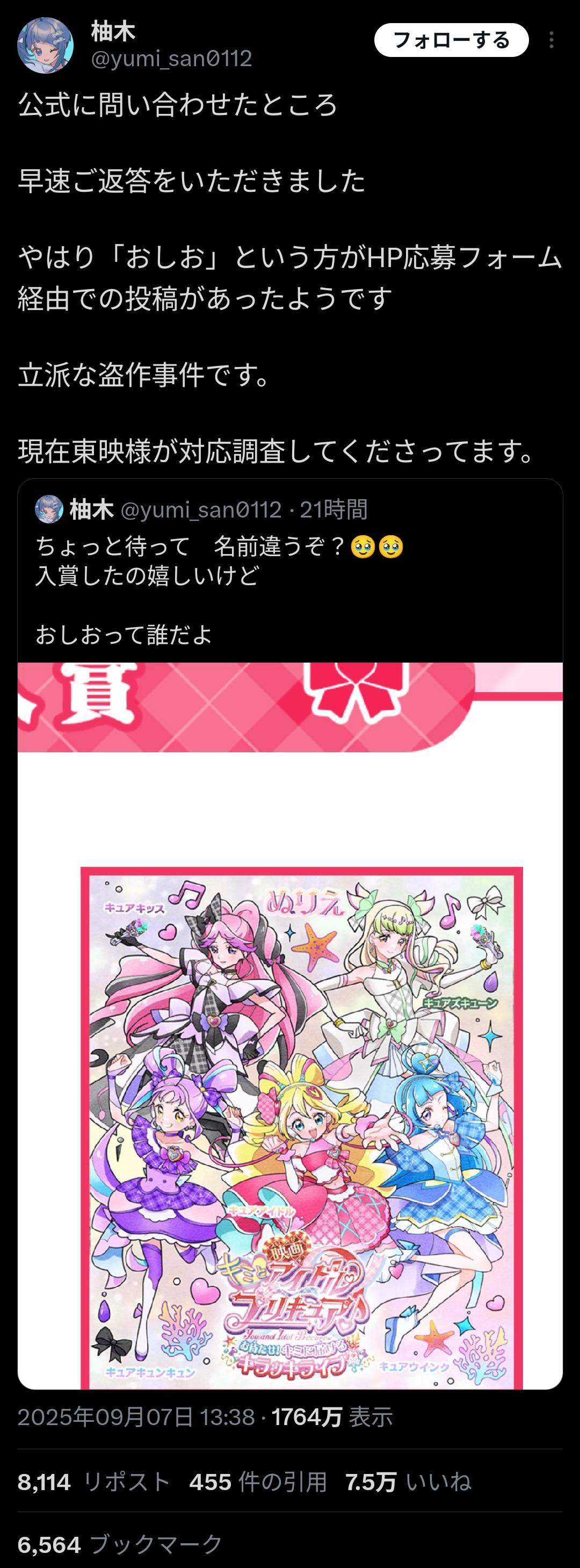 【画像】プリキュアお姉さん、子供向けの塗り絵コンテストで盗作されてしまう 2025/9/9 速報 1: document.write(” + ”); 関連記事 【悲報】プリキュアおじさん、軽々とライン超えをしてしまうwwwwww 【悲報】プリキュアショー、大きなお友達のせいで撮影全面禁止へwww 【動画】陽キャ「ほい、これが陽キャのプリキュアね」 【悲報】プリキュアおじさん達、コスプレした一般人を叩きまくる 【終了】プリキュア公式作家、正体を現すwwwwww document.write(” + ”); 続きを読む ——— Source: アルファルファモザイク 【画像】プリキュアお姉さん、子供向けの塗り絵コンテストで盗作されてしまう