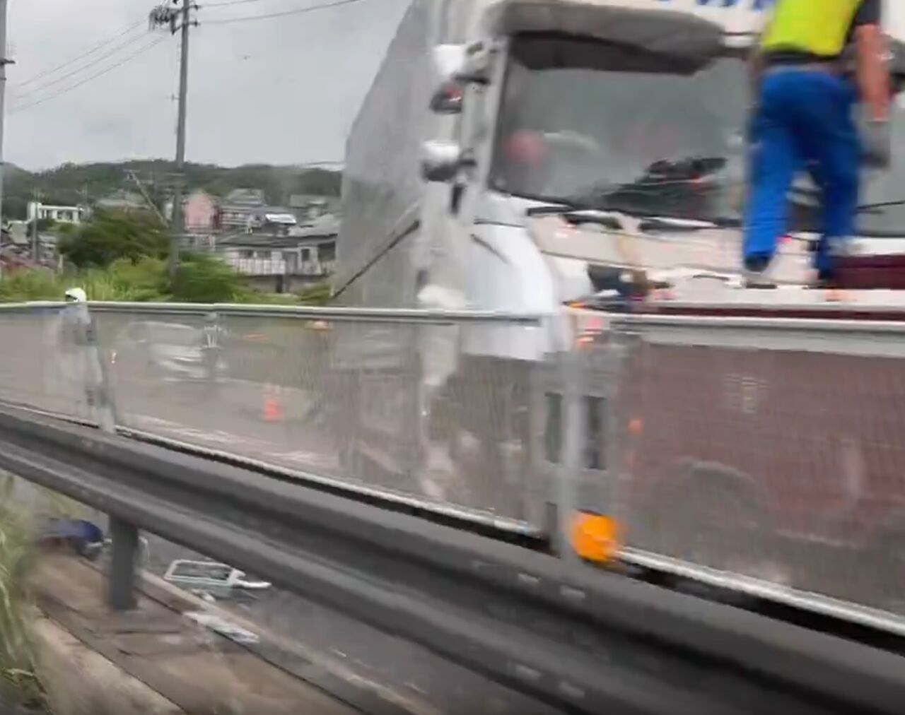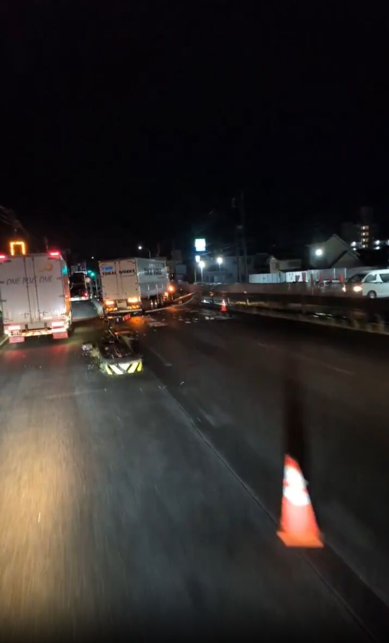 【現場の様子】#交通情報 国道1号線 上り 愛知県豊川市御油町 横綱ラーメン付近 破片散乱する大型トラック中央分離帯接触事故で規制渋滞9月11日 #愛知 #豊川 #御油