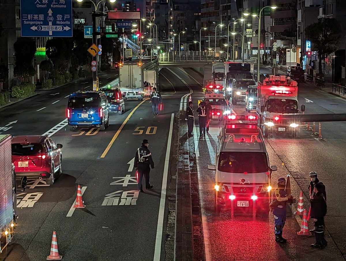大規模事故で長時間通行止めにするって警察が言ってた。靴とか色々散乱してたから環七朝まで通れなくなるかも。