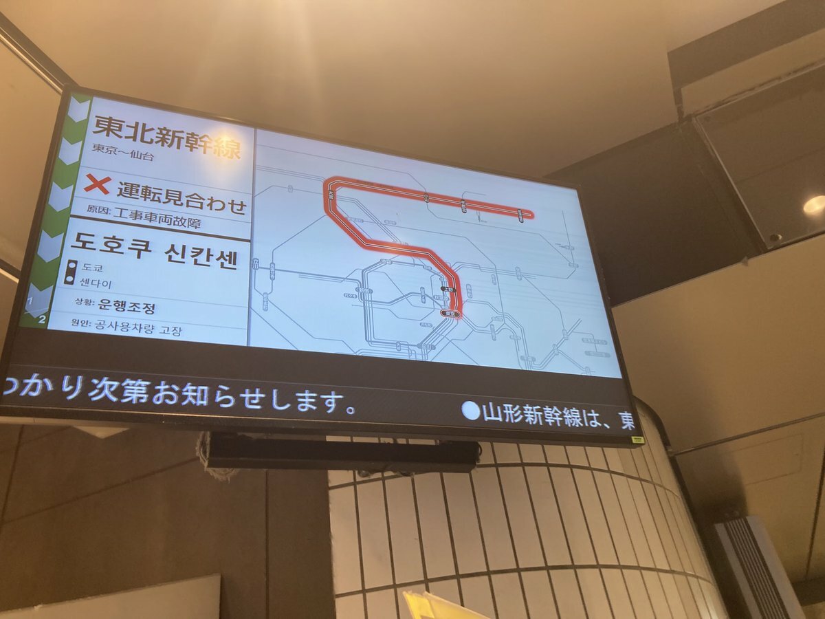 東北新幹線は、福島駅での工事車両故障の影響で、東京〜仙台駅間の上下線で運転を見合わせています。運転再開見込は立っていません。運転再開見込時刻はわかり次第… #東北新幹線 #Tohoku_Shinkansen https://t.co/MsYA6hQJi8— JR東日本【新幹線】運行情報 (公式) (@JRE_Super_Exp) April 1, 2024
