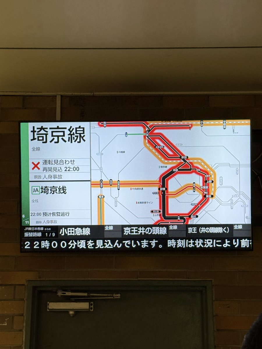 埼京線と山手線も運転見合わせで運転再開が22時頃だと😭