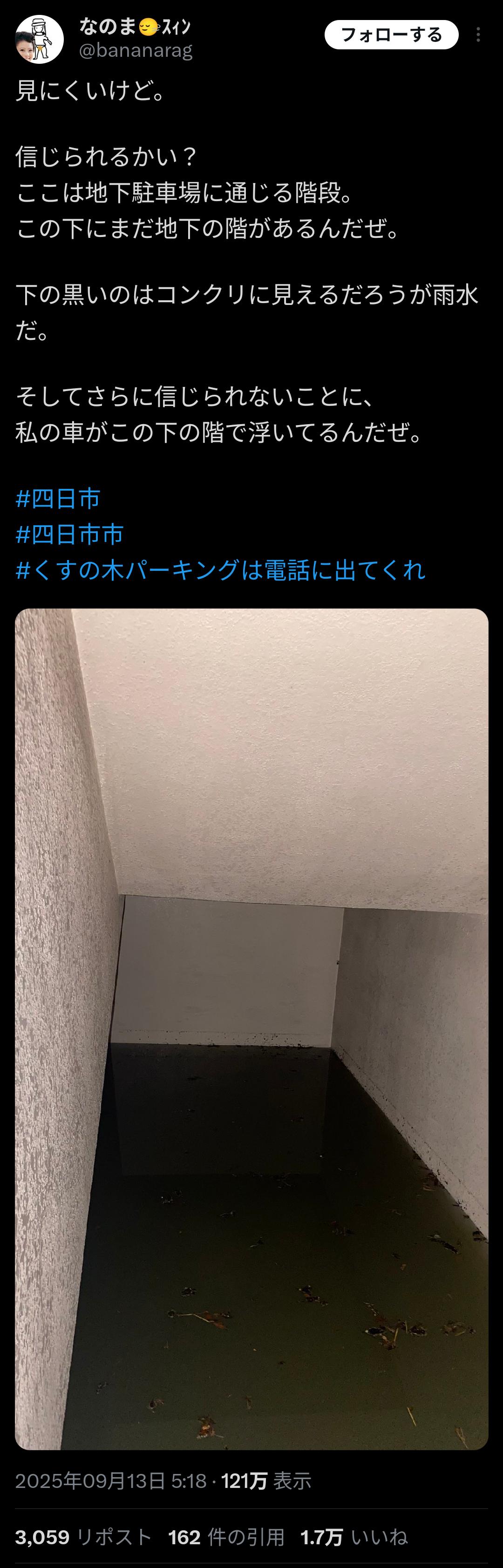 【画像】四日市パーキング水没事故、こういうことだった。 2025/9/14 速報 1: — (@3_1_1_0) ↓↓↓ — (@chunichi_mie) ↓↓↓ document.write(” + ”); 関連記事 【悲報】四日市、水没し悲惨なことに document.write(” + ”); 続きを読む ——— Source: アルファルファモザイク 【画像】四日市パーキング水没事故、こういうことだった。