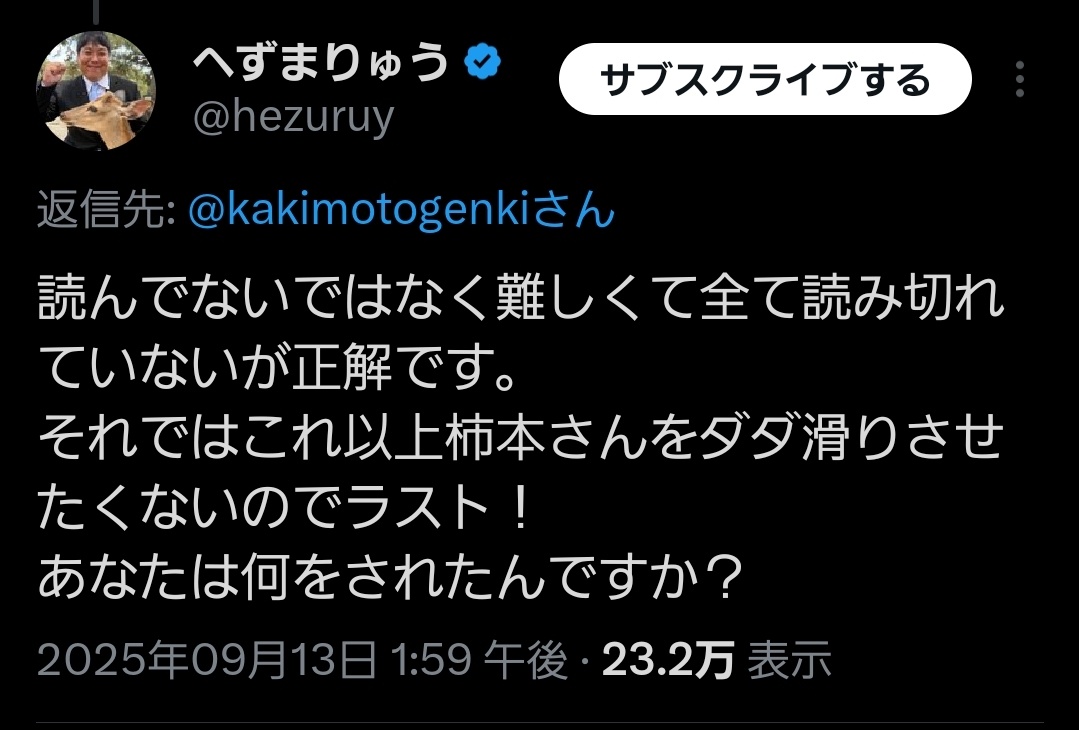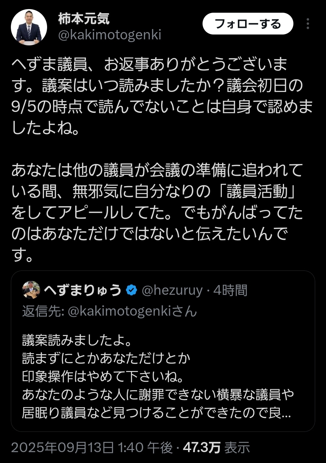 【悲報】へずまりゅう議員、議案も読まずに議会に出てたことを暴露され撃沈wwwwwwwwwwwwww 2025/9/14 速報 1: 大丈夫なの?🤗 document.write(” + ”); 関連記事 「4年間100万人に見られていると思え」へずまりゅう市議が議会で市長批判、幹事長会で対応協議へ 【炎上】へずまりゅうさん、画像を合成か? 「AIとか言われていますがAIではありません。引き続き話が分からない人はブロックします。」 【速報】へずま議員の議員報酬額、「少ねぇって!!︎!」「少なくねぇって!!︎!!︎」と激論wwwwww 【悲報】へずまりゅう、覚醒 【悲報】前川喜平氏「へズマ(へずまりゅう)。こんなやつ日本にいてほしくない。」 document.write(” + ”); 続きを読む ——— Source: アルファルファモザイク 【悲報】へずまりゅう議員、議案も読まずに議会に出てたことを暴露され撃沈wwwwwwwwwwwwww